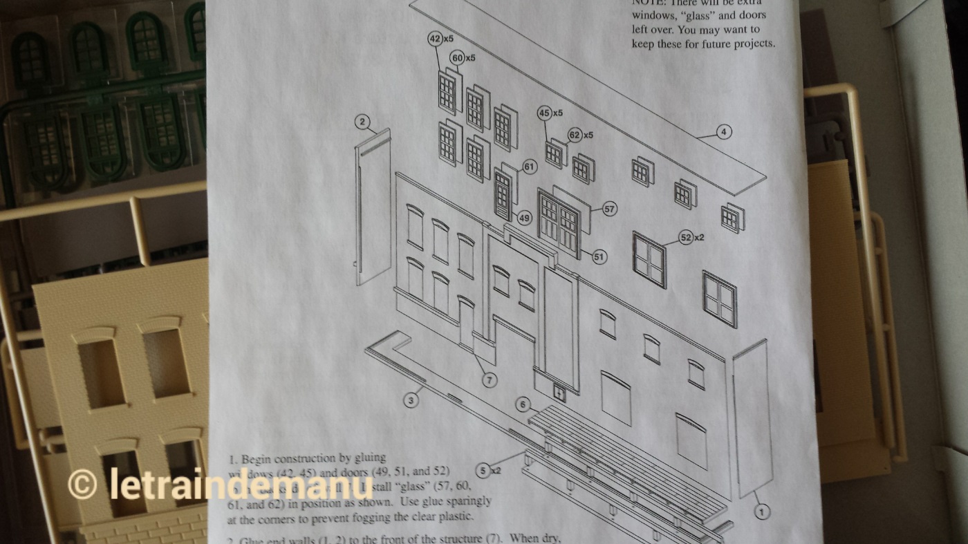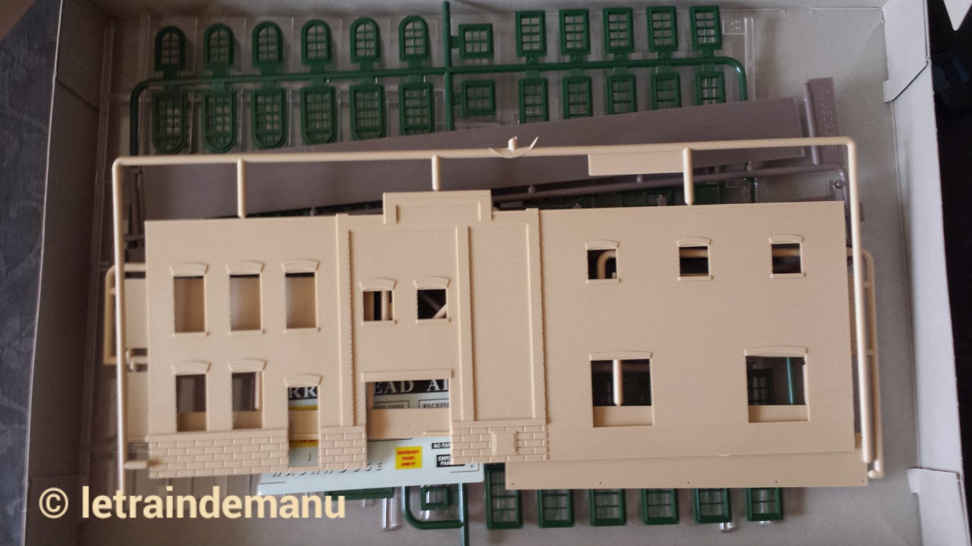 J’avoue avoir été un peu déçu à l’ouverture de la boite. Moi qui étais habitué aux maquettes Faller, Volmer et Kibri, assez détaillées en général, la maquette Walthers-Cornerstone m’a paru un peu dépouillée. Deux grappes pour les murs, une grappe de fenêtres, deux de vitres, une dernière pour le quai de marchandises et une planche de décalcomanies. Dès lors, le montage s’annonce très simple, même si la notice est entièrement en anglais. La présentation introductive au recto indique d’ailleurs qu’il s’agit d’une brasserie. Mais la maquette peut être utilisée pour toute activité industrielle.