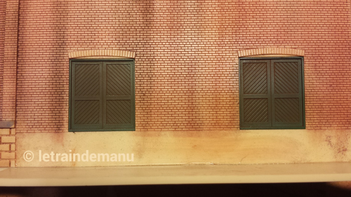 Les portes et fenêtres – grappe verte – sont repeintes en vert (Humbrol 88 mat) puis patinée avec de la terre à décor verte (Vert mousse de chez FR décors).