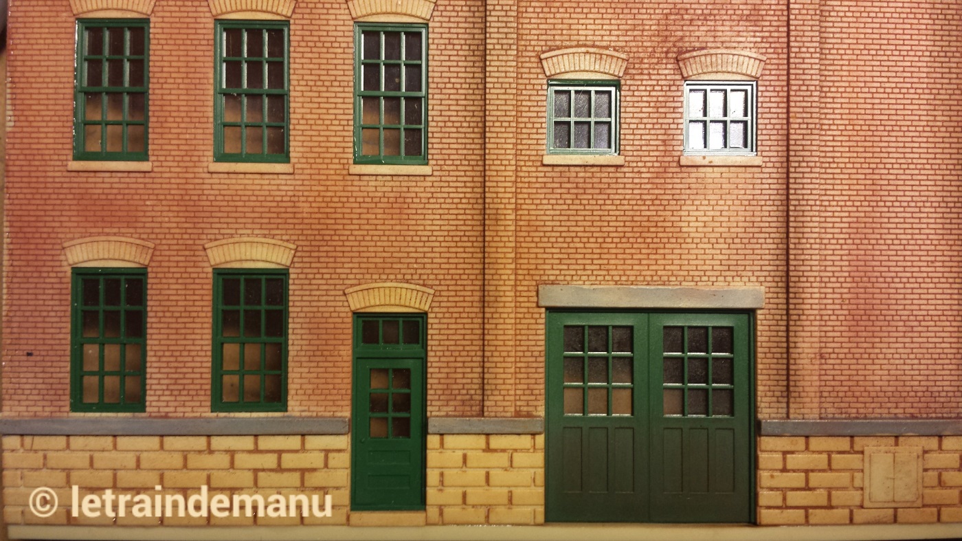 Le modèle représente en effet une façade de bâtiment industriel – de 311 mm de long sur une profondeur de 50mm – avec un partie administrative ou atelier et une partie entrepôt avec un quai de chargement. Le kit peut donc convenir à de nombreuses activités. Je n’ai d’ailleurs pas encore défini la branche professionnelle qui sera représentée, celle-ci sera sans doute dictée ultérieurement par les coups de cœurs qui impulseront les achats de figurines et de véhicules qui y donneront vie.