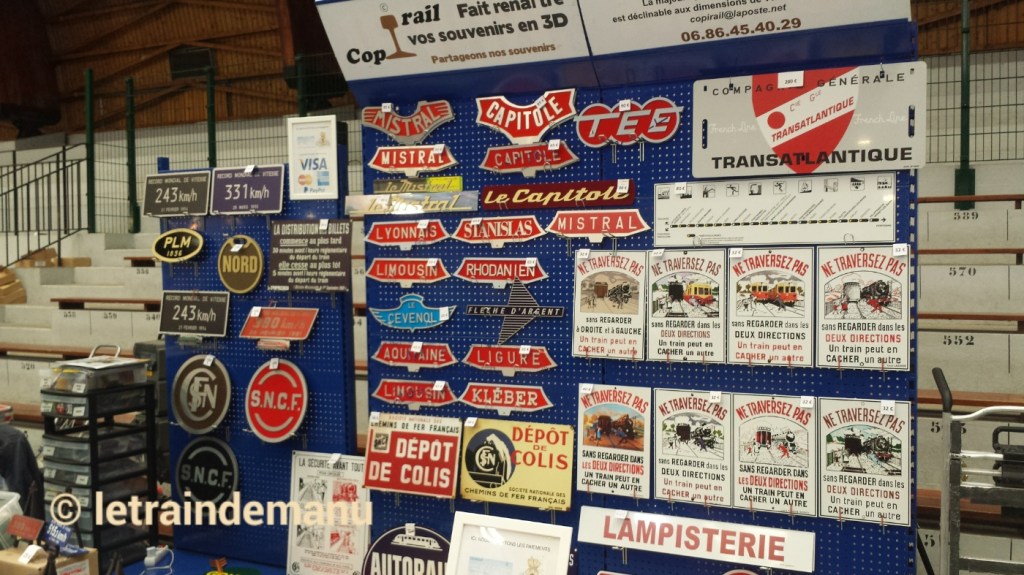 La société Copirail exposait ses reproductions de plaques ferroviaires (photo 142 ci-dessous). Il y en avait de toutes tailles et donc pour toutes les bourses. Le amateurs trouveront chez Copirail de quoi décorer la façade de leur réseau voire la pièce dédiée à celui-ci pour ceux qui ont cette chance.