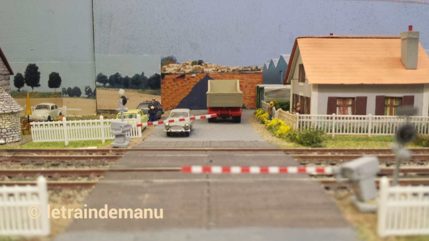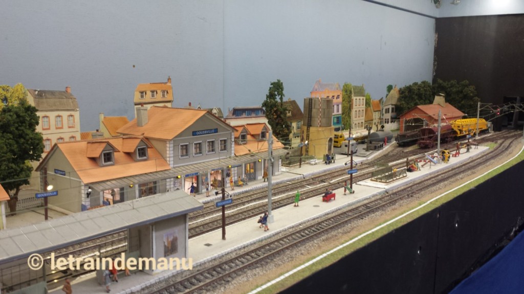 Retour au Ho avec le réseau modulaire du Club de Modélisme Ferroviaire de Goussainville. Avec la gare de Gousseville, dont l’intérieur détaillé était mis en valeur par un éclairage soigné et la zone marchandises animée par le transfert d’une locomotive à vapeur à l’aide d’une grue, l’ensemble bénéficiait d’un arrière plan bien traité à l’aide de photos (photos 166 à 171 ci-dessous). Dommage que la perspective du passage à niveau ait été bâclée.