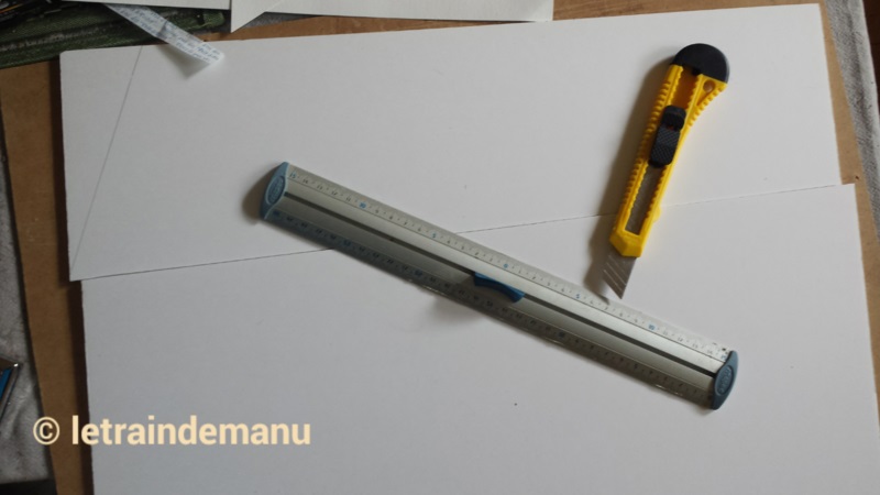 Comme la chaussée sur laquelle elle débouche, elle est réalisée en Carton-plume©. Sur une simple feuille en papier je conçois tout d’abord le gabarit aux côtes exactes que je reporte sur le Carton-plume© de 10mm. La découpe est réalisée avec un cutter à lame neuve. Je conseille d’utiliser une règle métallique carrée pour ces travaux : La règle évite le ripage de la lame. Accessoirement, ça protège aussi les doigts (photo 183 ci-dessous).