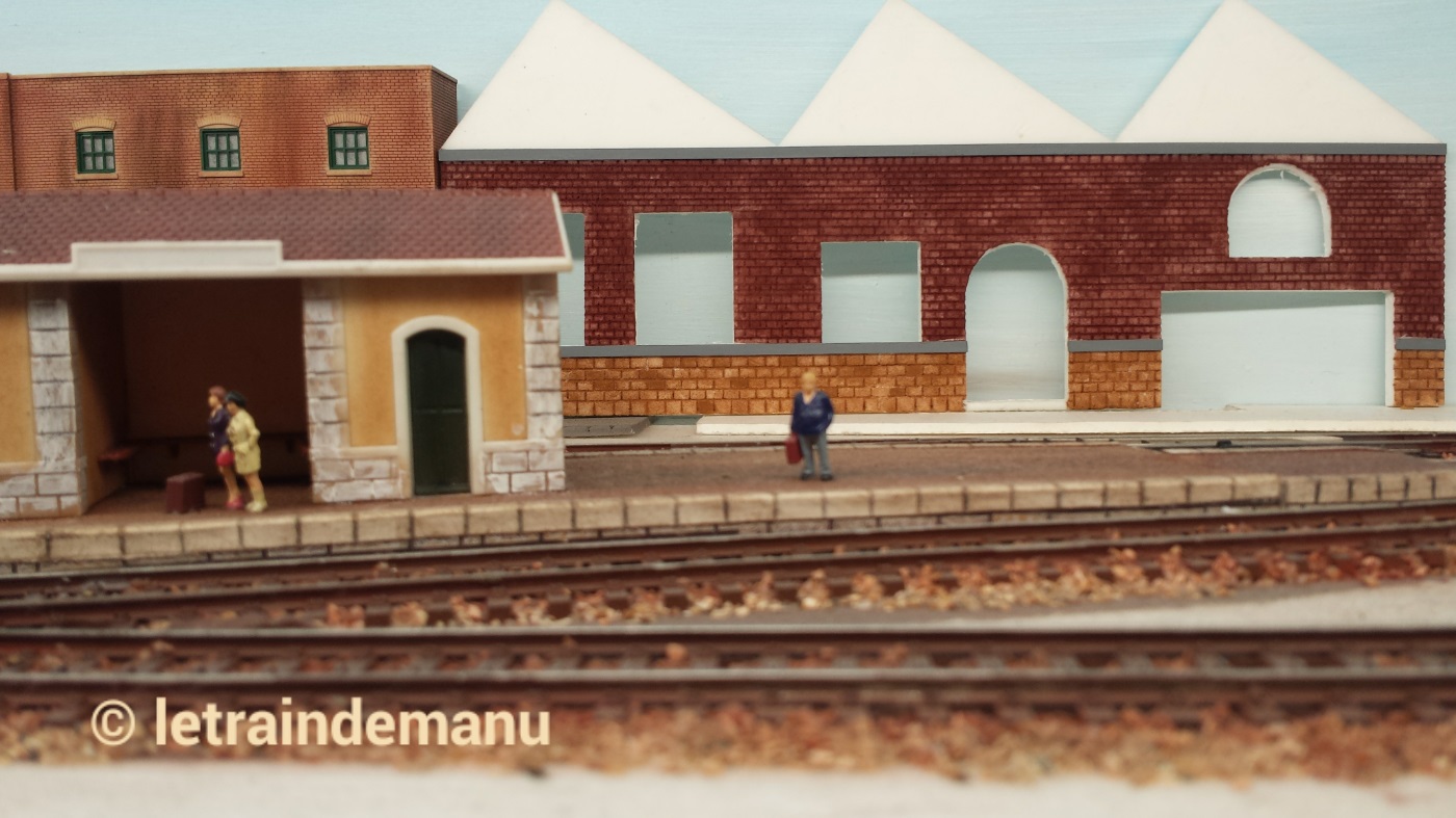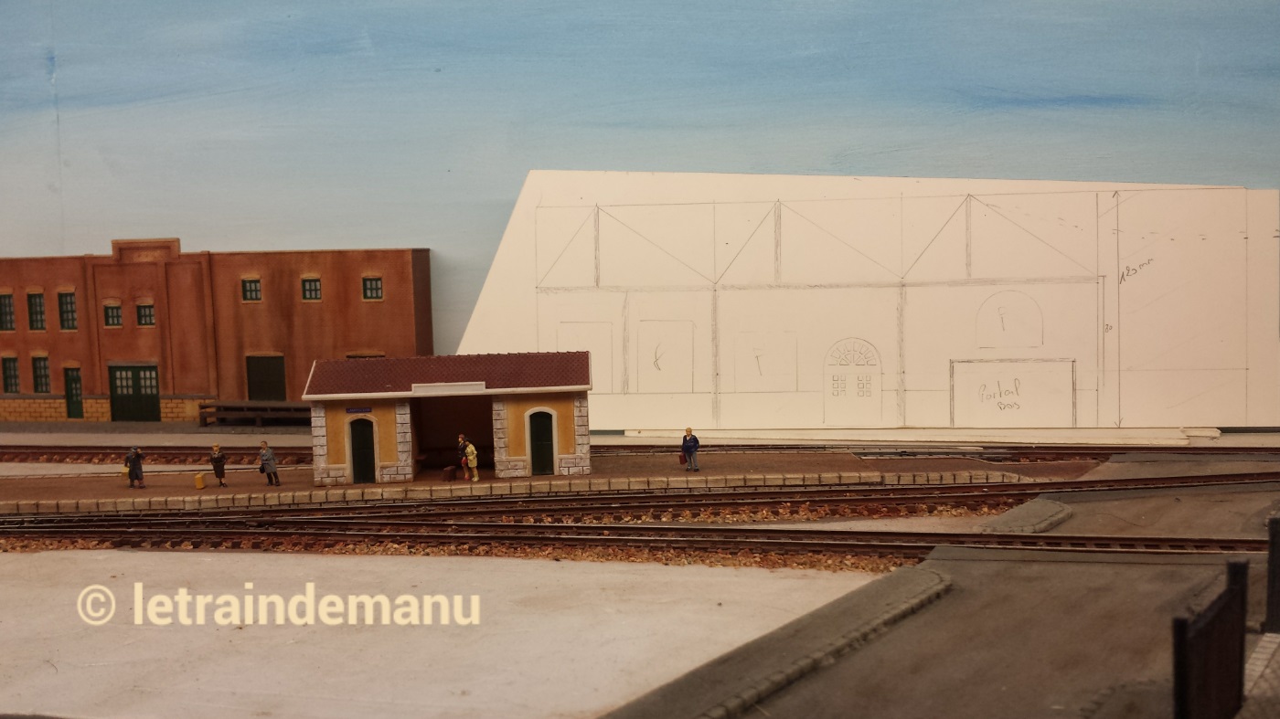 Sur la photo 214 ci-dessus, j’ai imaginé que cette façade pourrait être placée légèrement en biais pour casser la rectitude du fond. Cela va me compliquer un peu la toiture, mais ça vaut sans doute le coup de rompre la rectitude du fond de décor. Sur la droite du futur bâtiment passe la route qui vient du passage à niveau. Sur la gauche, entre les deux usines, une clôture en pierre et un bel arbre pourraient apporter une touche de verdure, voire masquer une photo de bâtiment pour donner de la profondeur.