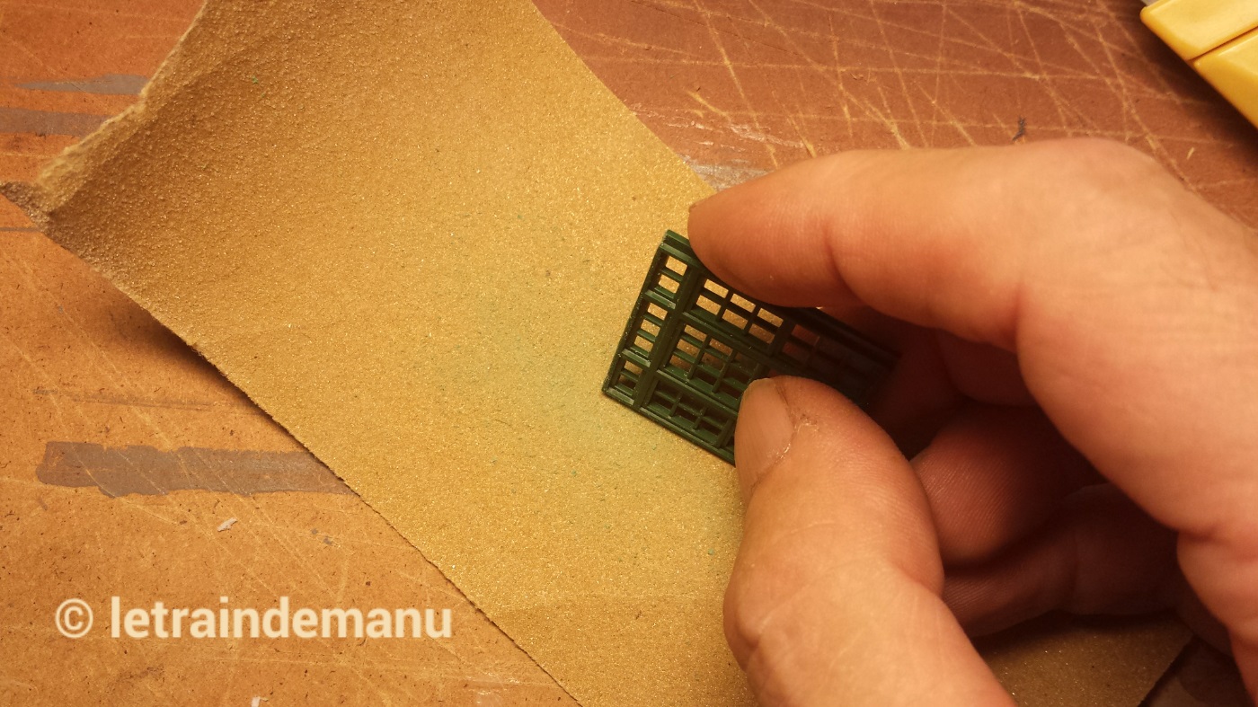 Ces pièces issues de maquettes plastique comportent un petit pourtour qui sert généralement à leur collage par l’arrière de la façade. Il va falloir le supprimer en intégralité puisque les portes et fenêtres devront être insérées dans la façade à mi- épaisseur du Carton-plume©. Il faut être méticuleux et prudent lors de ces opérations. Le premier risque est de se blesser les doigts par ripage du cutter. Le second est d’abimer les montants des pièces. Lorsque le pourtour a été découpé, je termine par un petit coup de papier de verre. Celui-ci est posé sur le plan de travail et je frotte délicatement les pièces bien horizontalement.