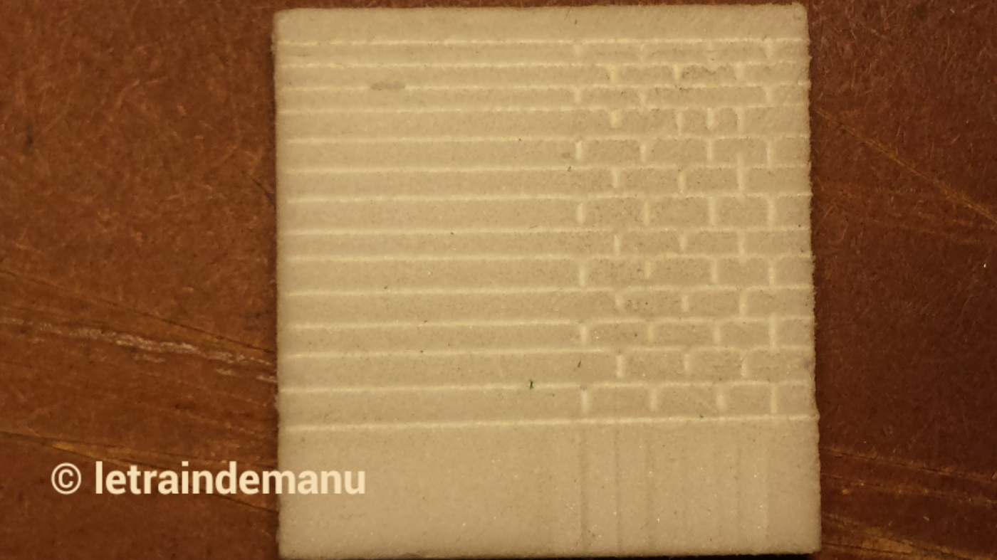Mes essais sur du Carton-plume© de 3 mm m’ont démontré la fragilité de ce support puisqu’il a tendance à se bomber. Je décide donc de travailler sur la base d’un Carton-plume© de 6mm qui devrait conserver une meilleure rigidité. Par ailleurs, étant prévu comme fond de décor, l’épaisseur de cet élément n’est pas rédhibitoire : Elle sera une transition visuelle entre les constructions en bas-relief et les simples photos futures. Toutefois, à l’échelle HO, cela représente un mur d’une épaisseur de 52 cm, ce qui est très épais. Il me faudra donc bien placer mes portes et fenêtres correctement pour diminuer optiquement cette surépaisseur. Cela sera d’autant plus important pour le portail en bois qui nécessitera de retravailler l’épaisseur sur ce point.