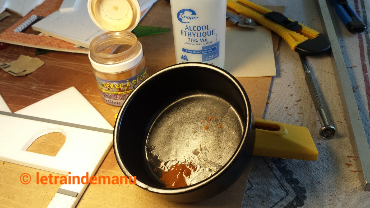 Dans un petit ramequin de cuisine, blanc de préférence contrairement à moi, je mélange 5cc d’alcool à 70° avec une petite dose de terre à décor prise sur le bout de la lame de mon cutter. La terre à décor étant un pigment, le dosage doit être parcimonieux. Je mélange bien avec mon pinceau n°2. On obtient donc un liquide coloré qui doit être parfaitement homogène. Il faudra mélanger systématiquement à chaque rechargement du pinceau, sinon les pigments retombent (Photo 224 ci-dessous). A défaut, la teinte du liquide va se densifier progressivement.
