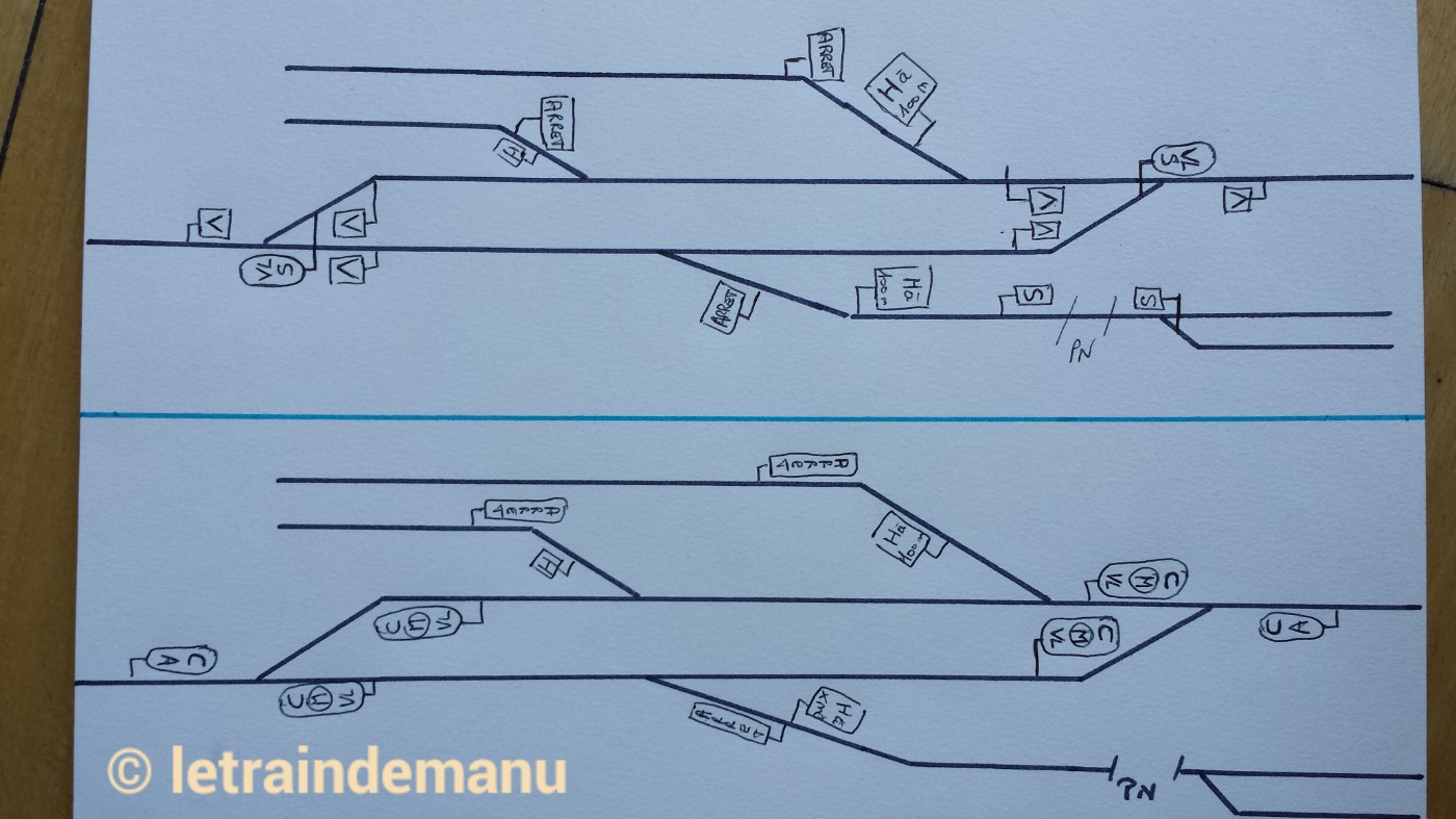 Dans le cas de ma halte devenue gare, il y a donc un signal sémaphore à chaque sortie de l’établissement, installé entre cœur et pointe d’aiguille et s’adressant aux deux voies (présence de deux flèches blanches). Un chevron pointe en haut est placé à la hauteur du garage franc. Les manœuvres étant conduites sous sémaphore fermé, le signal ne passe au vert que pour un départ en ligne vers la coulisse/extension.