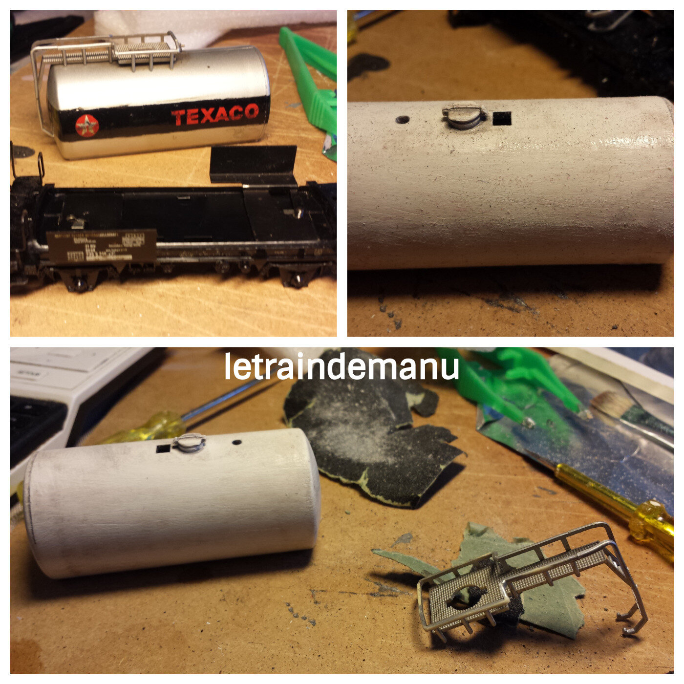 Contrairement aux wagons précédents, pour lesquels j’avais eu peu de travaux préparatoires, cette citerne et son marquage abîmé nécessitent d’être entièrement repeinte.