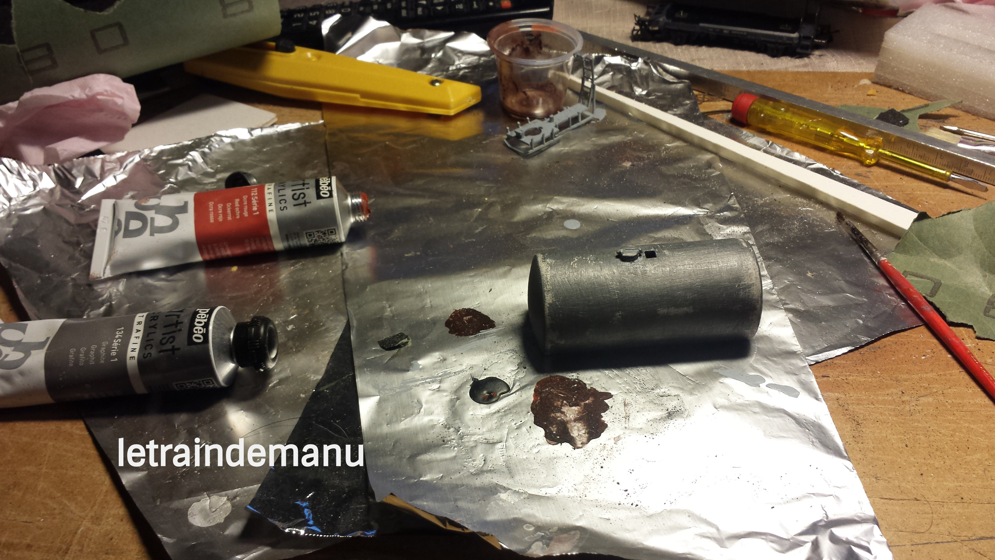Pour l’opération de peinture (acrylique), je choisis un gris clair. Je mélange donc un gris graphite 134 de chez Pébéo mélangé au blanc titane de la marque. Une fois la teinte choisie obtenue après un mélange de plusieurs minutes, le tout est dilué avec quelques gouttes d’alcool médicinal à 70°. La peinture doit être malgré tout assez consistante. Pour maintenir la citerne durant cette opération, j’insère la pointe de baguettes d’un restaurant asiatique dans les trous sous la citerne, l’autre extrémité (carrée) étant plantée dans une chute de polystyrène.
