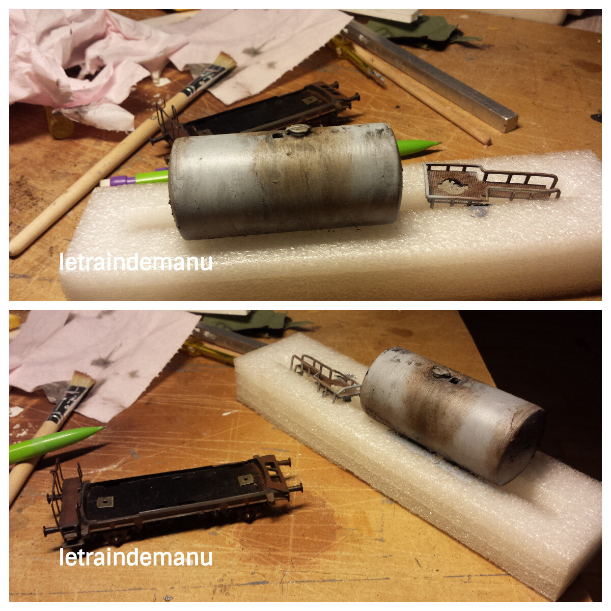 La première étape consiste donc à mettre ma citerne à nue. Après avoir retiré les essieux, il suffit de dévisser les deux vis des attelages pour que l’ensemble des composants se séparent : attelages, plaques latérales d’identification, châssis et citerne. L’échelle et l’accès supérieur se désolidarisent de leur logement facilement.