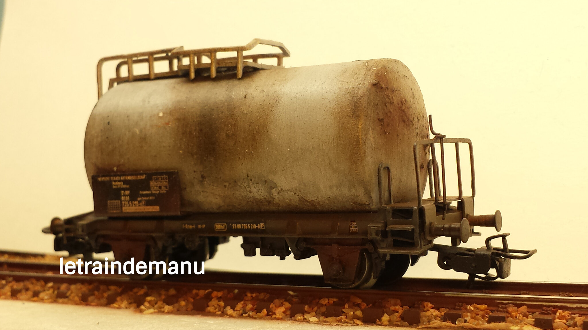 Pour ce quatrième exercice de patine sur le matériel roulant tracté, je jette mon dévolu sur l’un des wagons citernes offerts très gentiment par Olivier début octobre. Il s’agit d’un modèle à deux essieux édité en de nombreuses livrées par Märklin ces dernières années. Il s’agit de la référence 4750 en livrée Texaco et muni d’anciens attelages à boucles métalliques (Photo 308 ci-dessous).