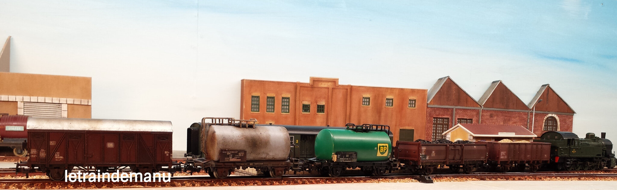 Au final, malgré les déboires successifs, j’obtiens un wagon citerne bien vétuste, en particulier l’application de colle en bombe m’a permis de figurer des écaillements de peinture rouillée. Son aspect final est sans doute perfectible mais de toute façon plus pertinent que le marquage d’origine très dégradé. Il conviendra très bien pour le transport de carburant de la compagnie et permet son intégration dans une rame de service de la CIC aux cotés de mon tombereau Ocem 29 chargé de sable.