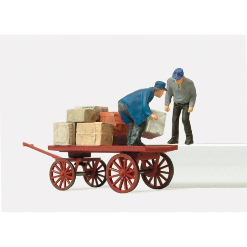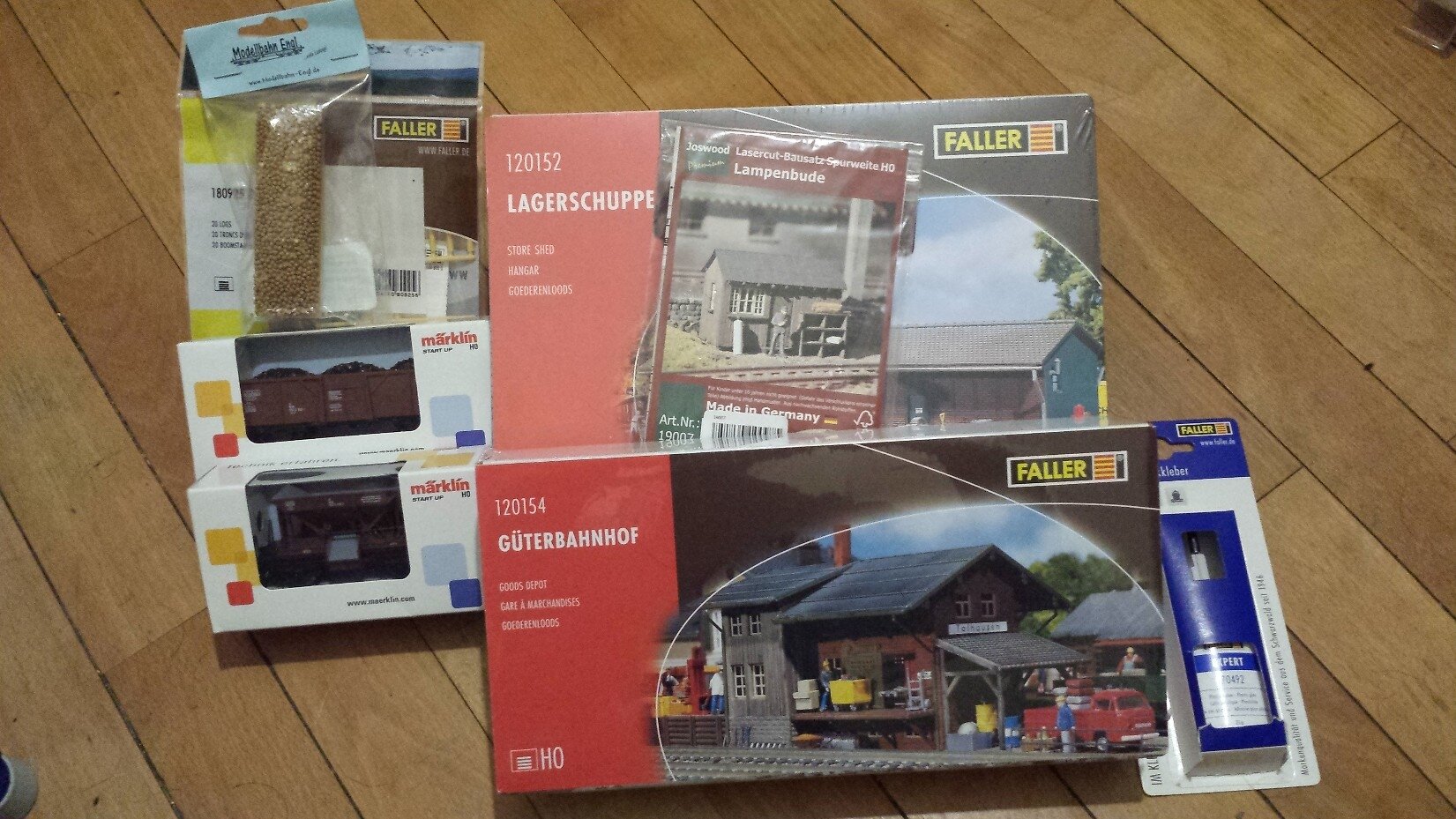 Une adorable charrette de marque Preiser (28084) avec caisses de chargement et deux manutentionnaires vont pouvoir agrémenter l’une des cours de la zone industrielle, un chargement de pommes de terres (Modellbahn Engl 313) permettra de diversifier les transports de mon Omm 52, ainsi que des troncs d’arbres (Faller 180925). Un flacon de colle Faller pour maquettes plastiques complète opportunément ce beau colis de Noël.