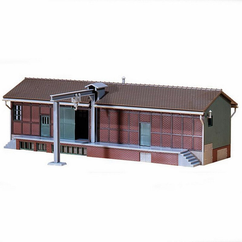 Le premier (Faller 120152) est un bâtiment technique avec quai et grue de chargement. Bien que le choix ne soit pas définitif, il est probable qu’il soit installé au droit de la voie embranchée E3a, embranchement d’un distributeur de produits énergétiques, au premier plan coté Est (produits pétroliers, charbon, gaz et bois de chauffage).