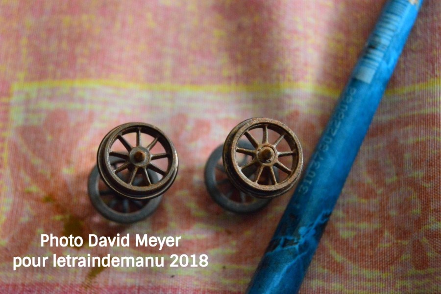 Les roues à rayons sont traitées à part, recevant d’abord un voile de rouille (a gauche) terre de sienne brulée, puis, un peu de salissure (a droite) gris chaud).