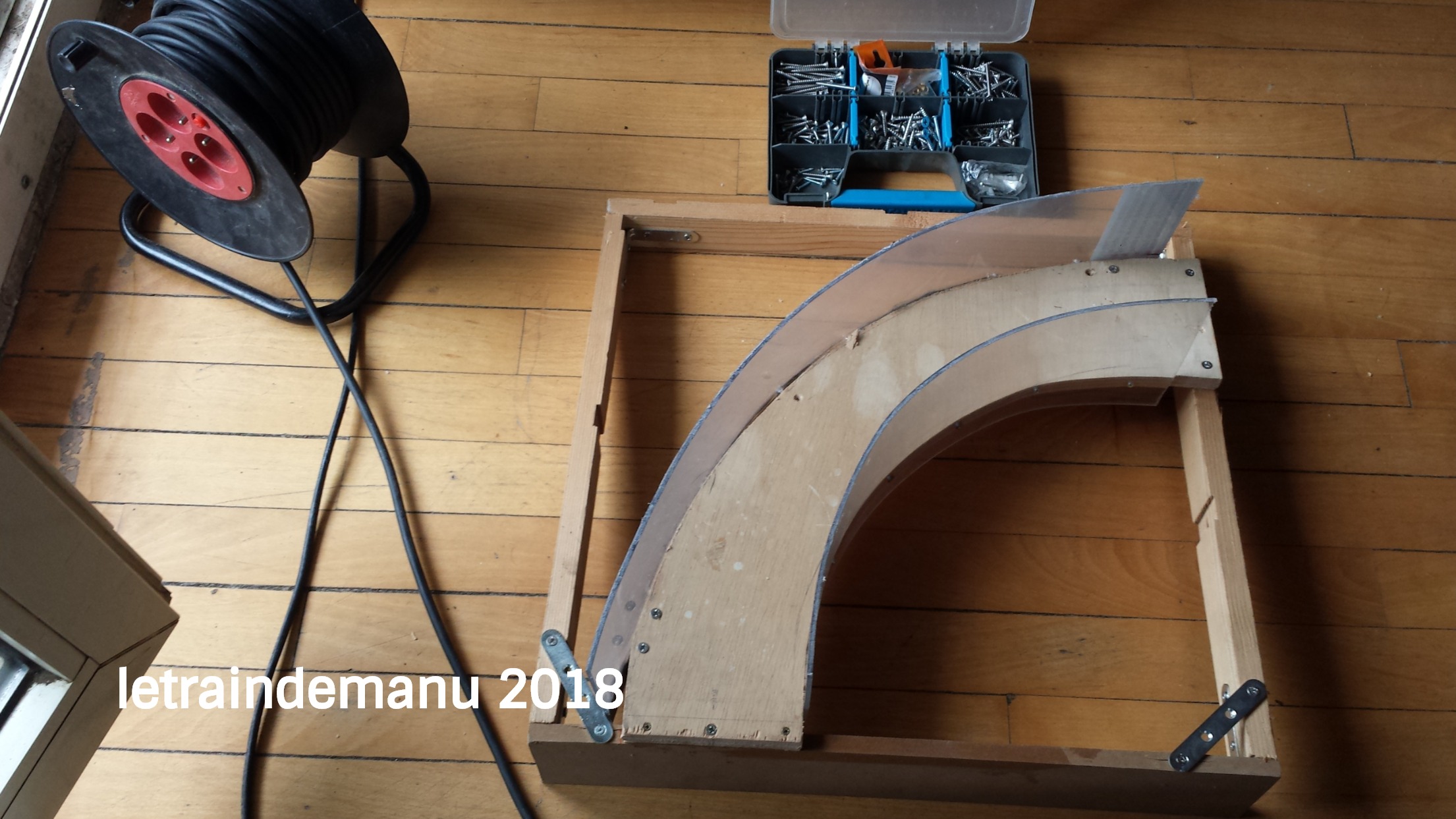 Photo 586 : un module ho en cours de construction. Il s’agit d’un module de liaison en angle non visible du public (module aveugle). Il est ici doté de deux parois antichute. Source : letraindemanu.fr