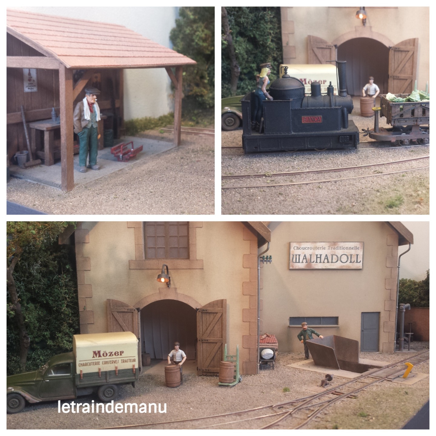 Les rails sont en code 75 soudés sur des traverses débités dans des plaques de circuit imprimé. Les bâtiments sont en carton, les toitures réalisées au Craftrobo et les portes en bois de tilleuls.