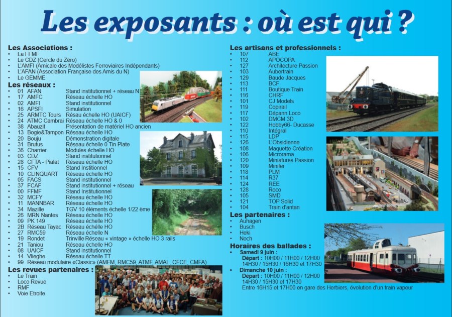 Avec 5 grandes associations de modélisme, 30 réseaux et stands institutionnels, 27 acteurs économiques, 4 marques industrielles et 4 revues spécialisées, le programme de cet évènement s’annonce particulièrement alléchant. Ci-dessous, la liste officielle des exposants et le plan de salle extraits du site officiel de la FFMF.