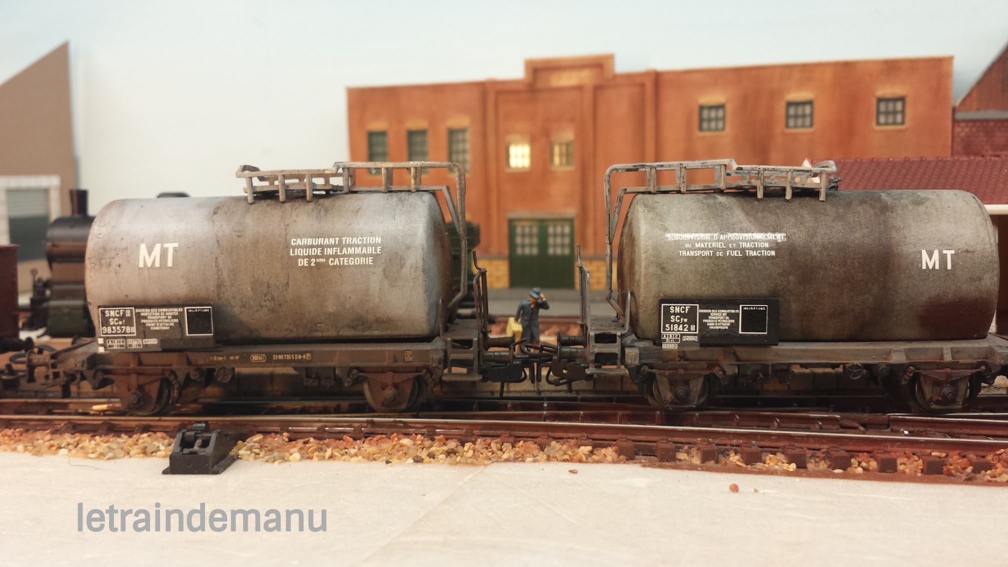 Photo 739 : Tutoriel marquages wagons citernes de service. L’un des deux wagons, version d’origine puis patiné. Source : letraindemanu.fr