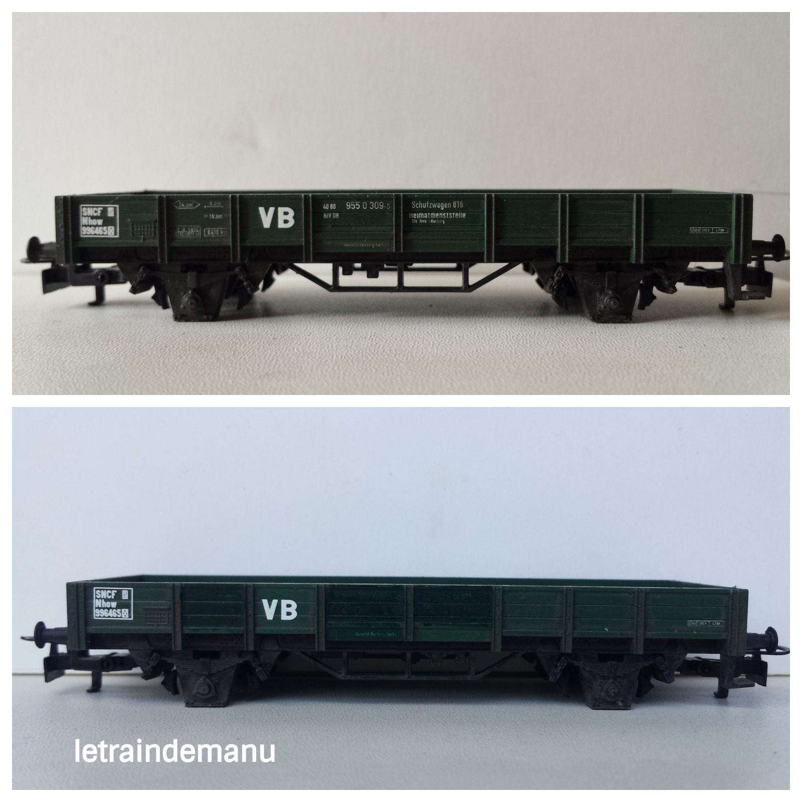 Je vais transformer ce wagon immatriculé à une entreprise allemande en wagon français. J’utilise ma planche de décalcomanies Atelier CJ Model’s référence 319 « marquages pour wagons de service époque III » : une immatriculation pour wagon plat et un marquage «VB» par face.
