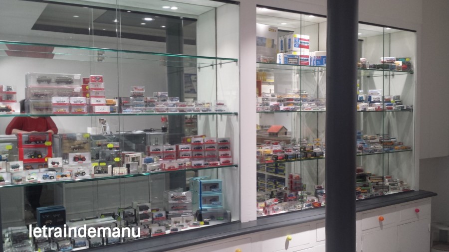 Photo 968 : quelques-unes des vitrines consacrées aux véhicules routiers dans le magasin « Paris-Modélisme » le 27 octobre 2018. Source : letraindemanu.fr
