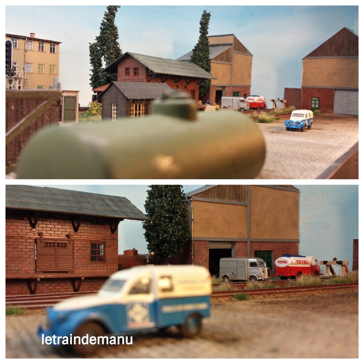 La palissade arrière, qui masque le moteur d’aiguillage, est réalisée en bois de cagette, gravé, repeint et patiné. J’avais évoqué de telles palissades dans l’épisode 36 » Boite à fromage pour palissade en bois « . La fosse de la cuve est construite en carton plume dont les faces visibles du spectateur ont été pelées. Le tout est peint en gris béton (mélange 50% blanc + 25% noir + 25% ocre). La citerne est une cuve de récupération offerte par Jeanne et Olivier et qui trouve ici une seconde vie.