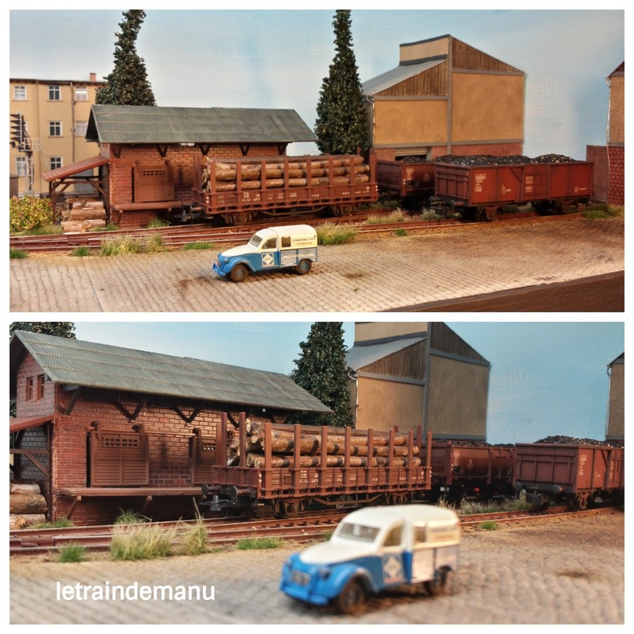 Le bâtiment principal est une création personnelle à base de Carton-Plume © gravé. J’avais décris sa construction dans l’épisode 116 titré « Le bâtiment du négociant en combustibles ». La halle à marchandises, transformée en entrepôt, est une maquette Faller 120154, offerte à Noël dernier et dont la plupart des pièces ont été repeintes.