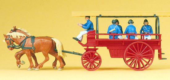 Au Moyen-âge, une veille urbaine était organisée dans des villes aux habitations très mitoyennes et surtout très inflammables. En cas de sinistre, le feu était combattu par de simples seaux d’eau acheminés par des chaînes humaines. Il faudra attendre le XVIIe siècle pour voir des pompes manuelles d’abord tractées à la main puis par des animaux. Preiser propose différents pompiers de l’époque 1900 [1]. Ils nous seront surtout utiles pour représenter une manifestation à caractère historique.