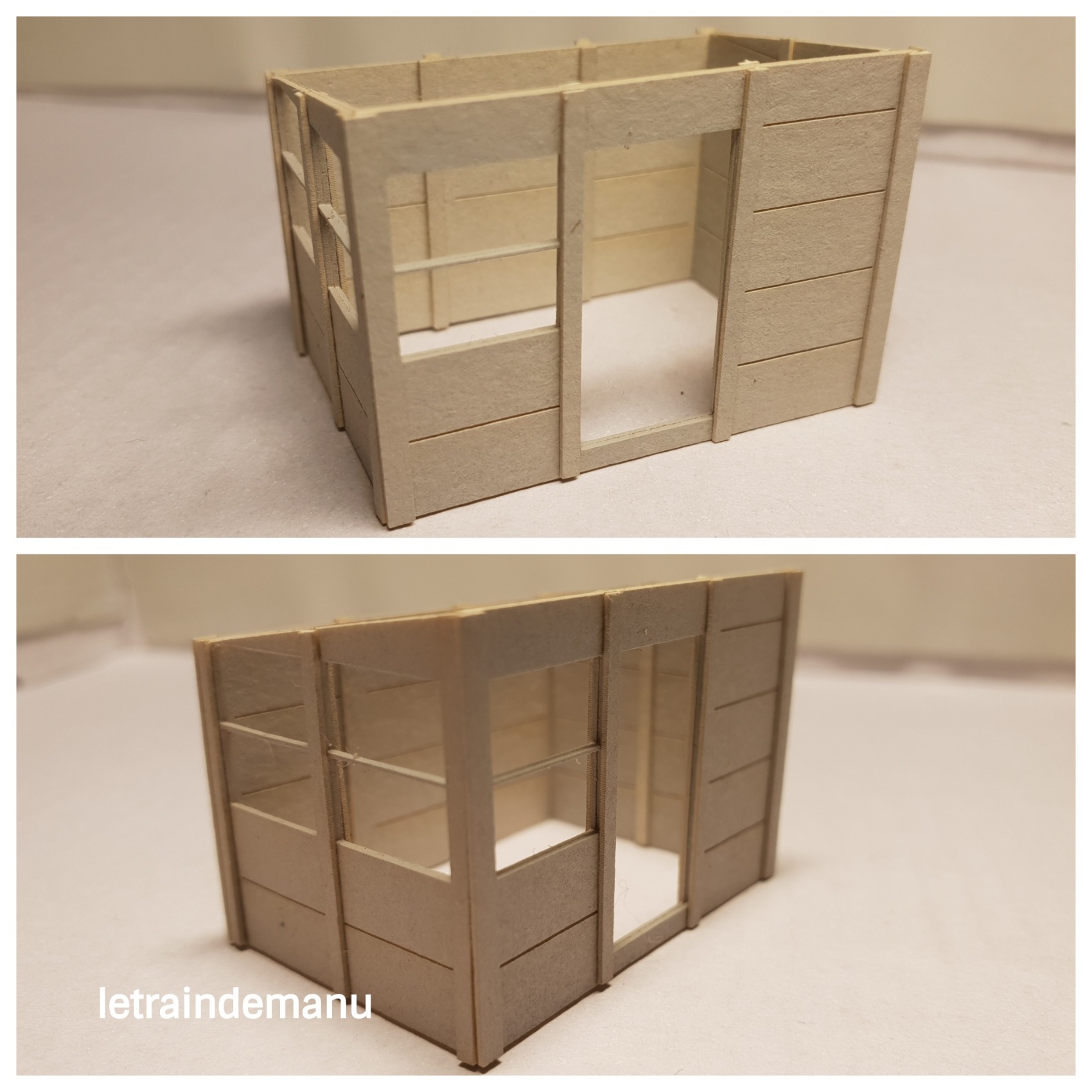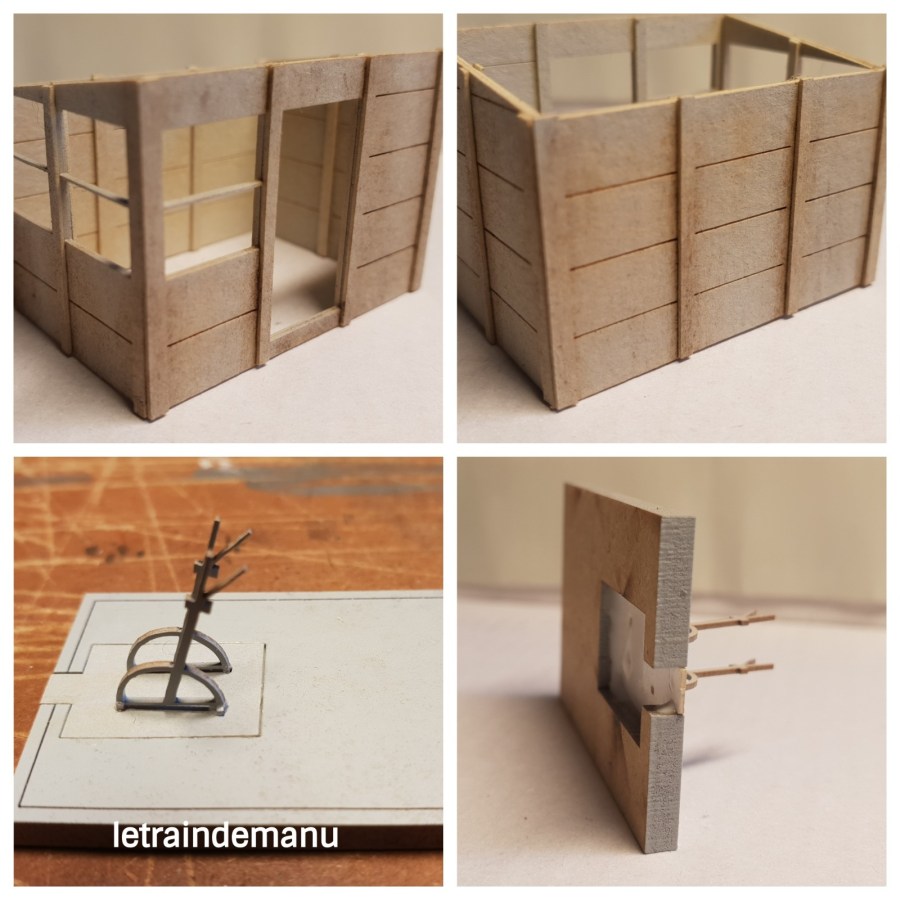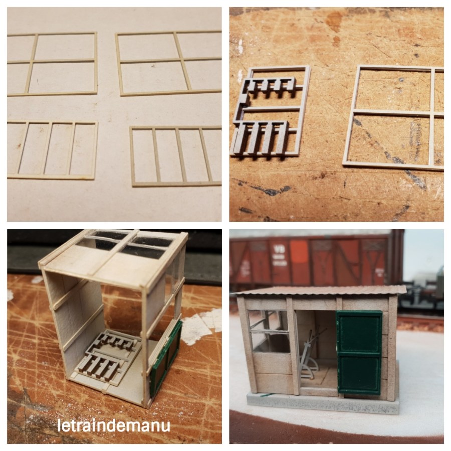 Photo 1040 : Assemblage des murs, pose des poteaux, cabine d’aiguillage Cités miniatures. Source : letraindemanu.fr