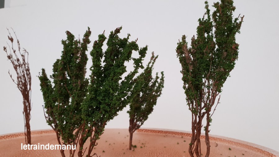 Dans cet esprit de débrouillardise, les arbres peuvent être aussi source d’économie. Certes, nous avons bien des créateurs renommés qui, tels Sylvia ou Arboris miniature, proposent de très beaux produits. Mais cette qualité artisanale a un coût que ma trésorerie ne peut tout simplement pas supporter. Quant aux arbres de nos industriels, leur qualité est très variable. Je vais donc tenter, puisqu’il s’agit là de ma première expérience en la matière, de me confectionner des arbres pour pas cher à base de thym séché. Si le résultat est concluant, ils pourront occuper une place de choix dans ma ZI Nord. Dans le cas contraire, ils se contenteront d’un arrière plan pour fermer l’un des angles du fond..