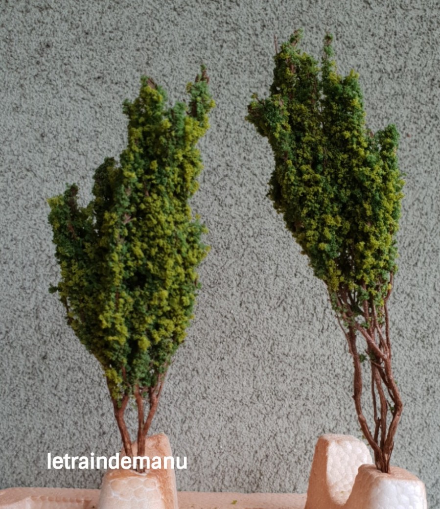 Le seul flocage en ma possession pour un tel travail arboricole est un flocage Heki vert foncé (réf. 1561) et un vert clair (réf. 1560) achetés chez Maketis à l’exposition de Chelles. Il y a sur le marché de nombreuses textures aux couleurs variées, il vous faudra faire des choix. N’ayant pas de recherche spécifique, mes achats en ce domaine sont généralement guidés par des coups de cœur lors de visites en expositions. J’aime voir, toucher, questionner. Nos exposants créateurs sont des passionnés qui aiment partager leur expérience et sauront vous orienter sur un produit adapté à vos attentes. Il faut seulement veiller à bien choisir des teintes allant du marron foncé au vert clair pour garantir une certaine homogénéité saisonnière sur un même module. Y compris sur un module enneigé que l’on imagine faussement d’un blanc immaculé.