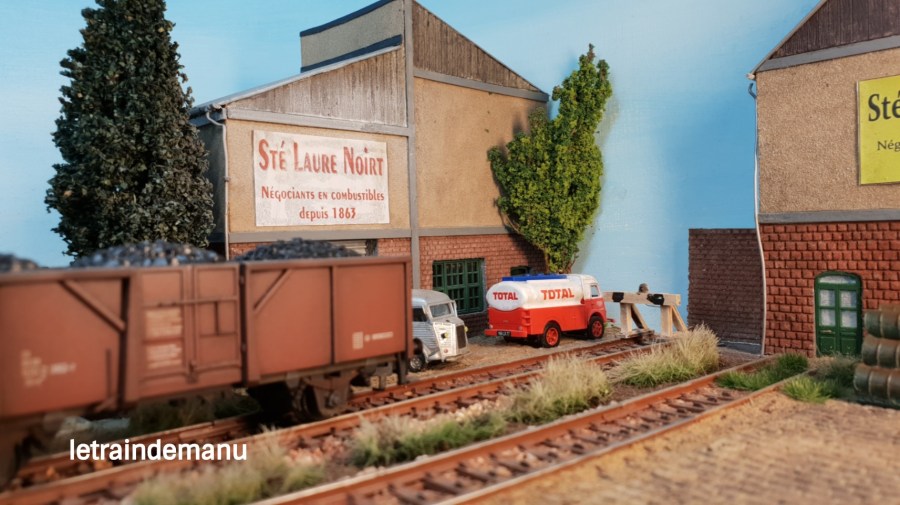 Les deux premiers arbres ainsi réalisés sont plantés dans la cour de la Société Laure Noirt : le premier, un peu plat sur une face est installé dans l’angle du hangar à charbon, ce qui me permet de masquer la jonction imparfaite du bâtiment avec le fond de décor. Le second, à l’entrée de la cour pour agrémenter la » Rue du Martyr du chat « .