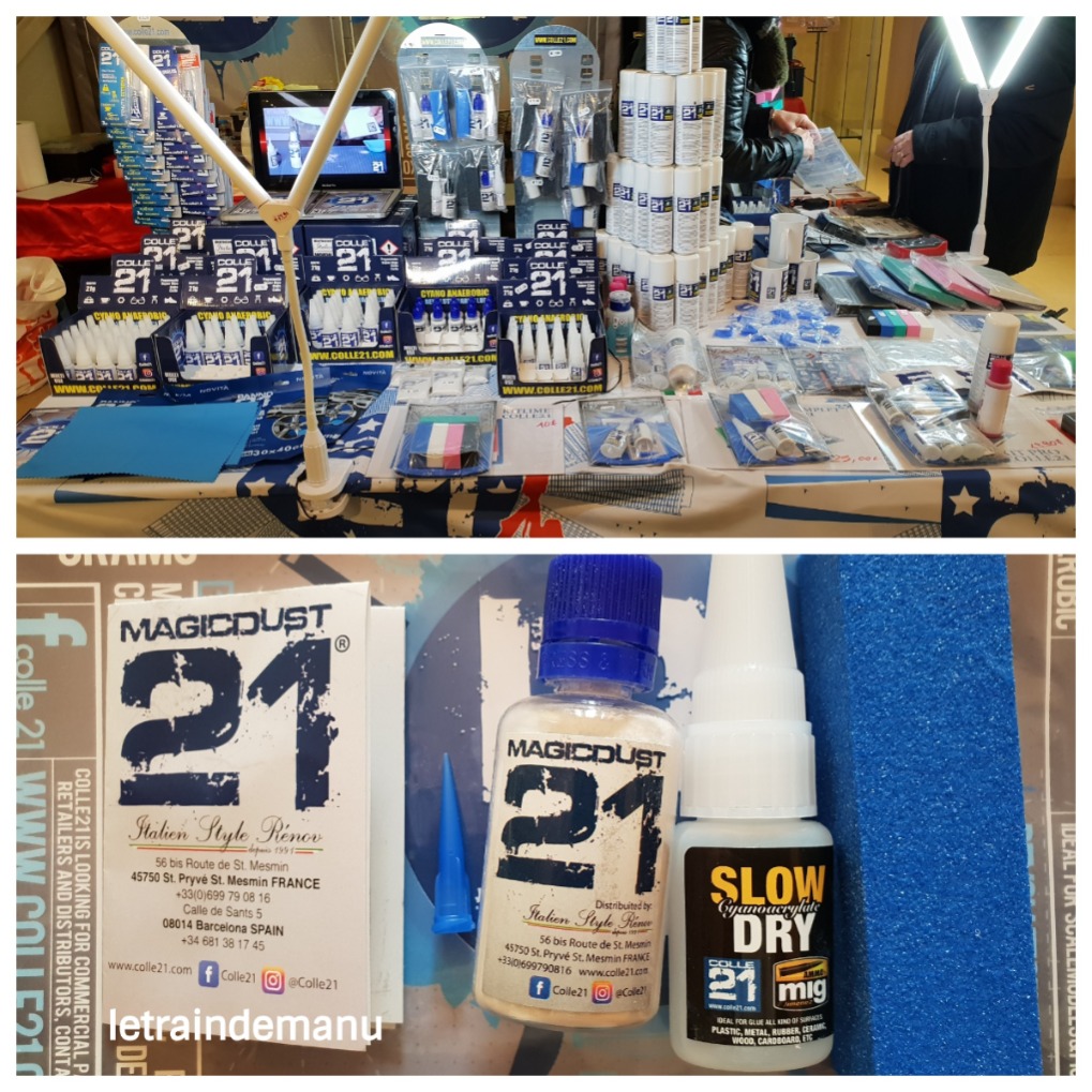 Une nouveauté qui intéressera tous les constructeurs de kits à toutes échelles : le Magicdust ®, C’est une sorte de poudre de verre qui s’applique sur la colle pour remplacer l’enduit de rebouchage. Il se lime et se peint comme un enduit de rebouchage. A découvrir. Ce nouveau produit est également vendu en kits de différentes présentations avec colle et limes. A noter que Colle 21 fournit ses produits techniques avec des notices en six langues.