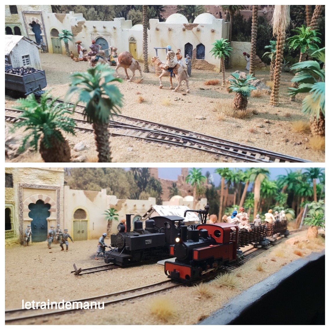 Déjà vu à l’exposition du RMB à Gennevilliers qui fut sa première présentation française, ainsi qu’à Liberty-Rail, l’œuvre de Franck Combe nous transporte dans une oasis imaginaire marocaine en 1918, période trouble sur le plan militaire en raison des insurrections anticoloniales. L’auteur, également adhérent du RMB, a donc imaginé une ligne à voie étroite utilisée tant par les civils que par les forces armées.