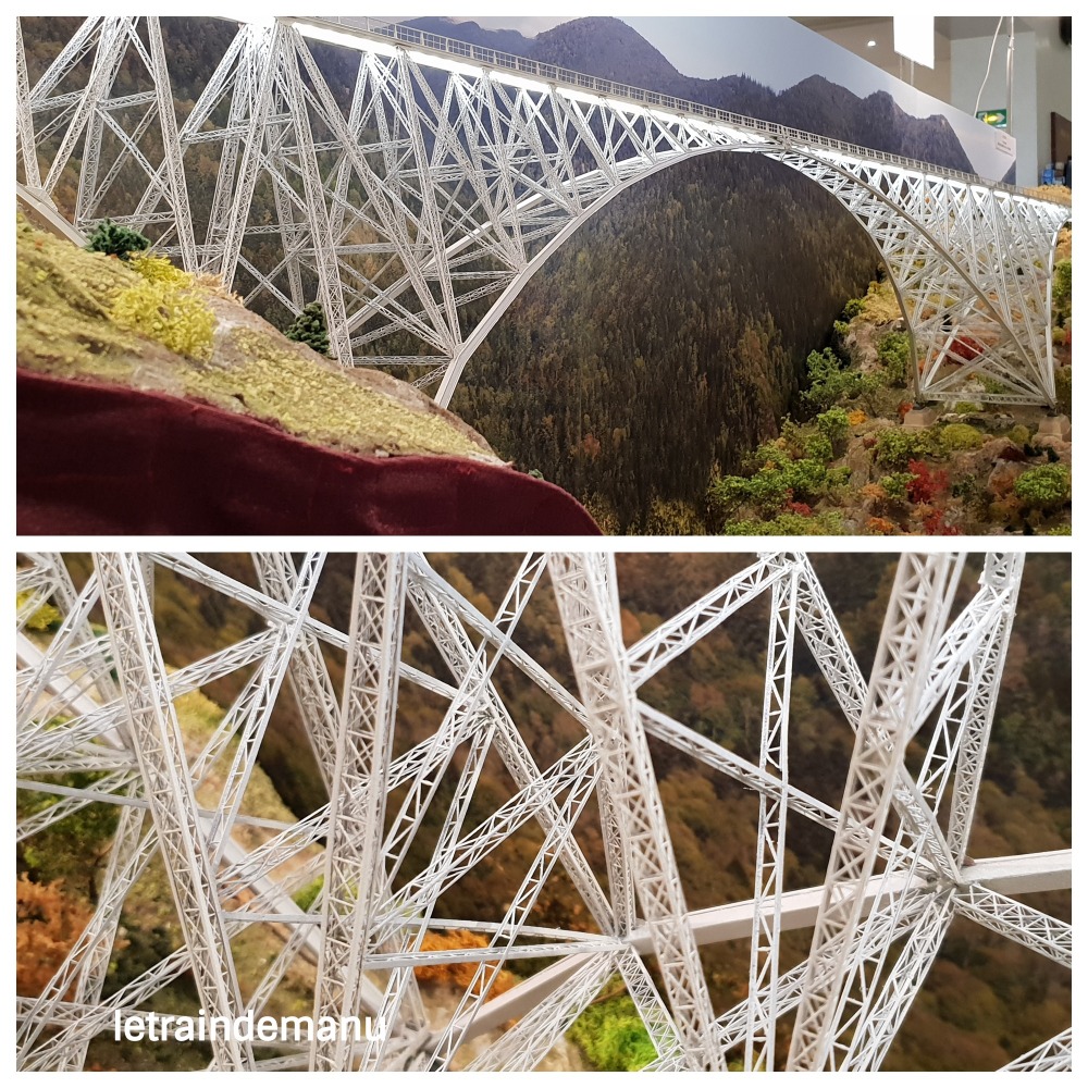Cette œuvre grandiose traitée à l’échelle N est un émerveillement pour les yeux tant les détails sont restitués avec une grande finesse. Il a nécessité quatre ans de travaux dont neuf mois pour le seul viaduc, d’une longueur de 2,87 m.