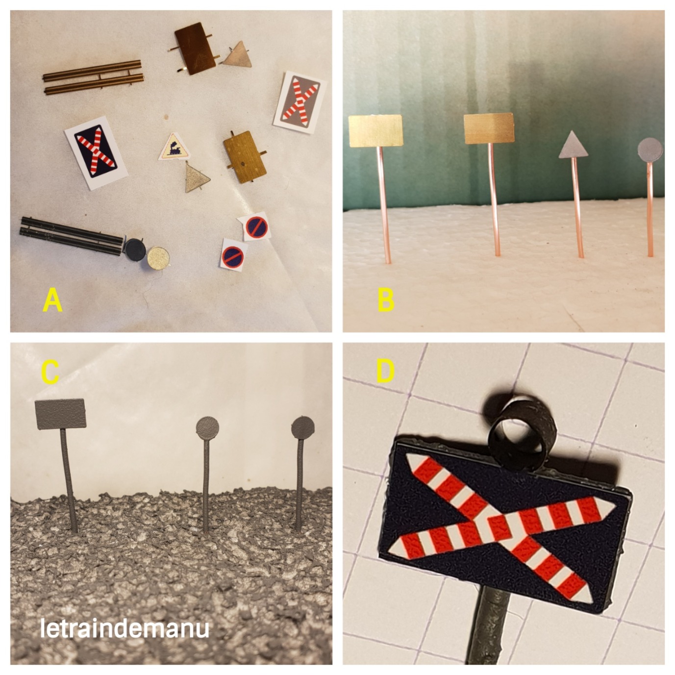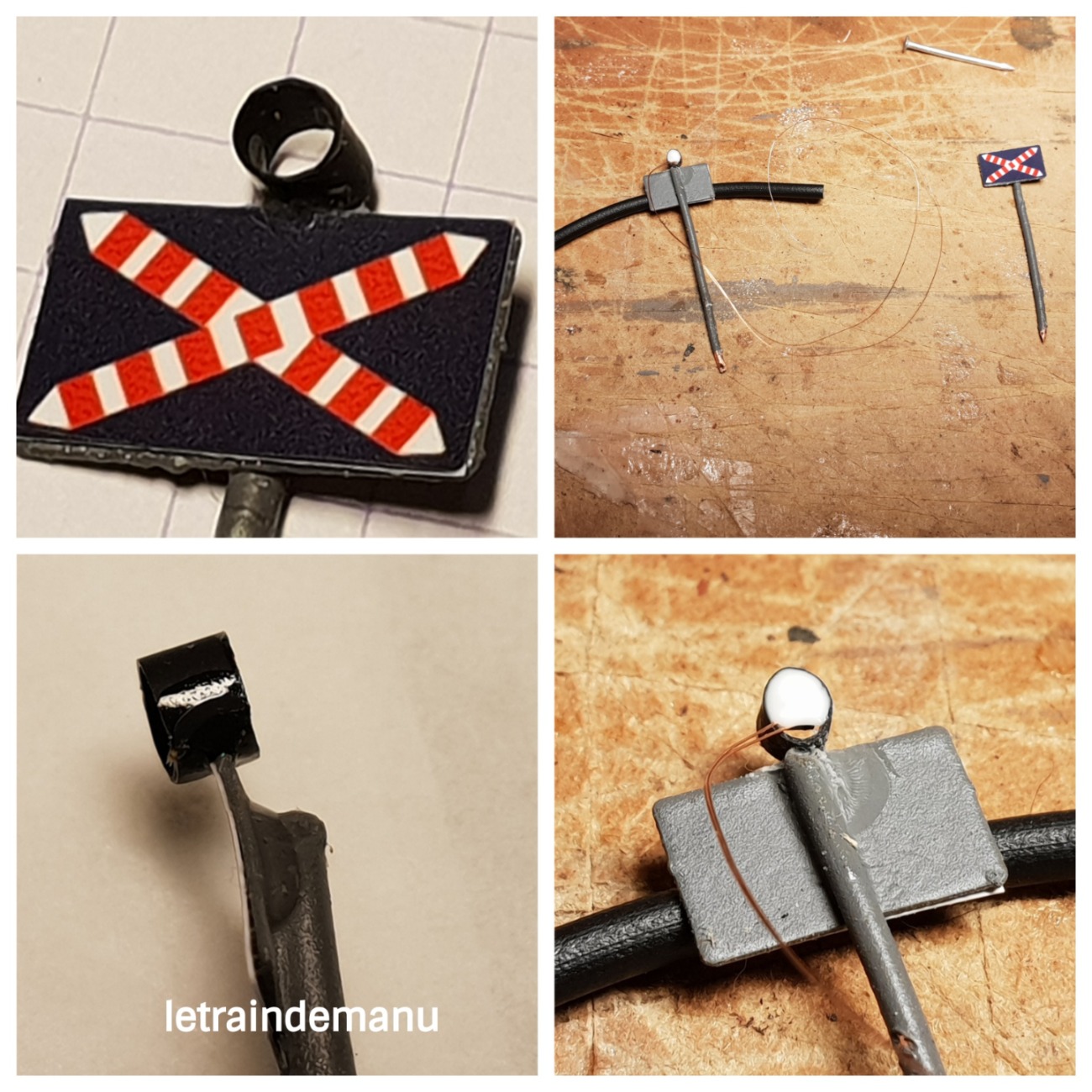 J’avais initialement envisagé les panneaux de chez ABE. Malheureusement, je me suis heurté à un manque d’outillage adapté car ils nécessitent en effet d’être pliés dans le sens de la longueur pour former un U. Et ce sont de petites pièces (Photo 1125 A). Il va me falloir investir si je veux me lancer dans ce type de kits laiton. Après quelques essais ratés – mais pour le coup ABE n’y est pour rien -, j’ai donc pris la décision de remplacer les poteaux par du câble électrique de 2,5 dégainé. Les cibles sont collées sur les poteaux à la colle cyanoacrylate de chez Colle 21. Je reviendrai prochainement sur ce fournisseur (Photo 1125 B).
