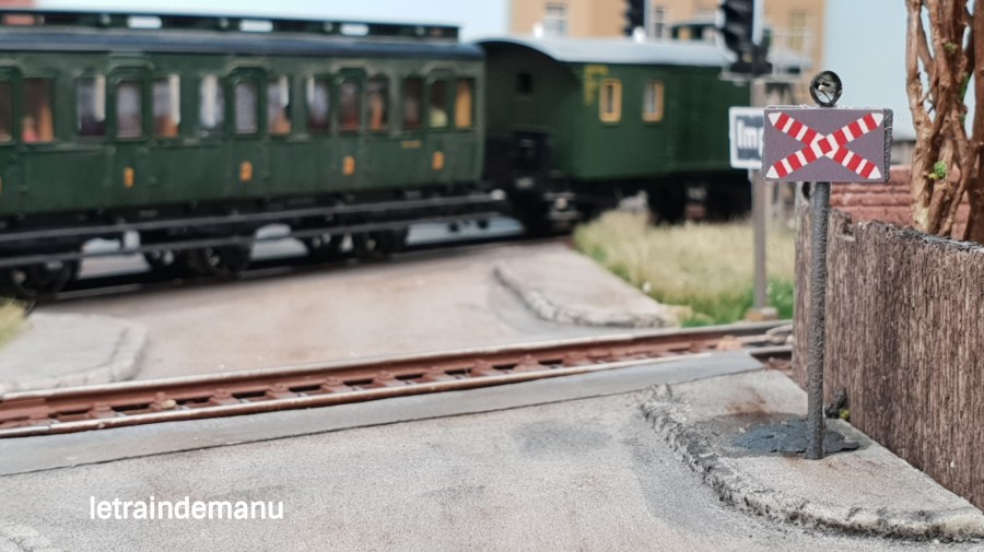 – à distance, par un panneau de danger modèle A8 symbolisant une locomotive à vapeur et avertissant d’un passage à niveau sans barrière. Ce panneau sera surmonté d’un feu orange clignotant fonctionnant conjointement avec les panneaux de position. Il est censé être positionné 50 mètre avant le croisement. Dans mon cas, la distance est compressée, sinon ce panneau serait hors champs.