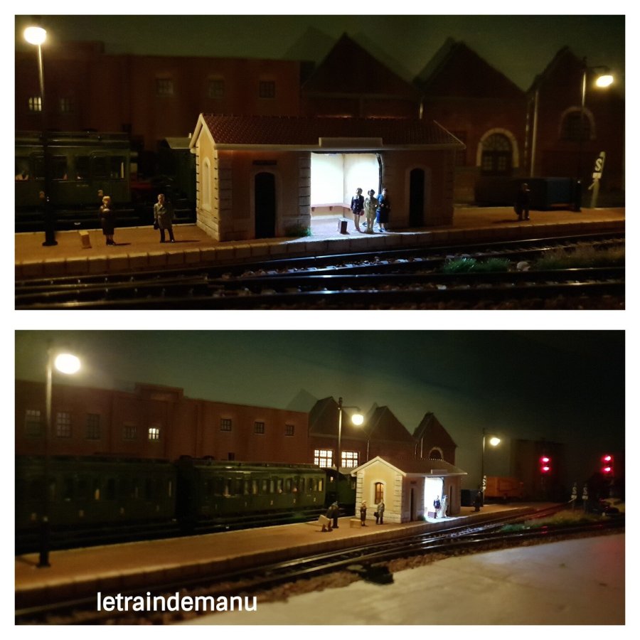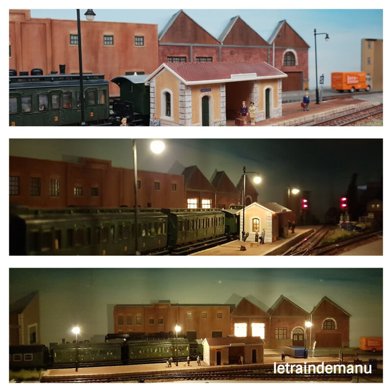 Après ce premier test, il m’est apparu nécessaire d’éclairer l’intérieur de l’abri de quai. J’ai donc utilisé un kit d’éclairage initialement acheté chez le même fournisseur pour un autre immeuble. Il s’agit d’une led pré câblée blanc froid, ce qui peut parfaitement convenir à un abri de quai dans lequel la lampe d’origine aurait été remplacée par un éclairage à tubes néon. Ce contraste avec les lampadaires blanc chaud n’est finalement pas si anachronique et guide l’œil du spectateur vers ce bâtiment.