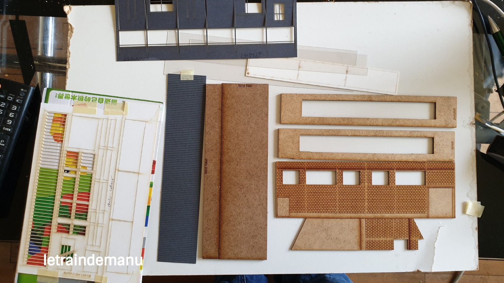 Ces pièces sont découpées dans des cartons dont le recto est autocollant. C’est pratique, car ça évite les bavures de colle sur ces pièces fines. Ne jeter surtout pas vos chutes ! Conservez-les dans votre boîte à rabiots, au besoin dans des sachets zippés étiquetés car elles peuvent être utiles à l’avenir. La pellicule se retire assez facilement, mais il faut être minutieux lors du dépelliculage des pièces, en particulier les fenêtres et les armatures. L’ adhésif permet une pose précise tant que l’on n’appuie pas fortement. Après, c’est irrémédiable. Les cabines d’aiguillage du même fabriquant, montés il y a quelques semaines, sont une excellente référence pour s’exercer à cette technique.