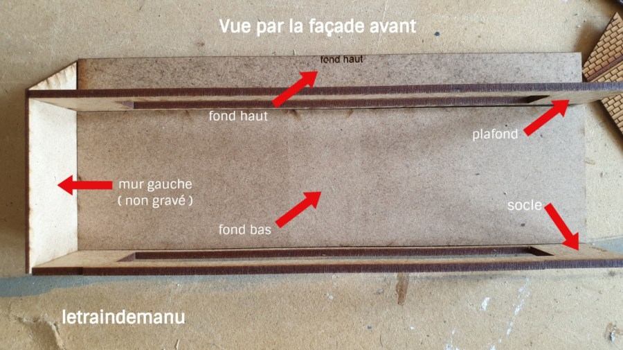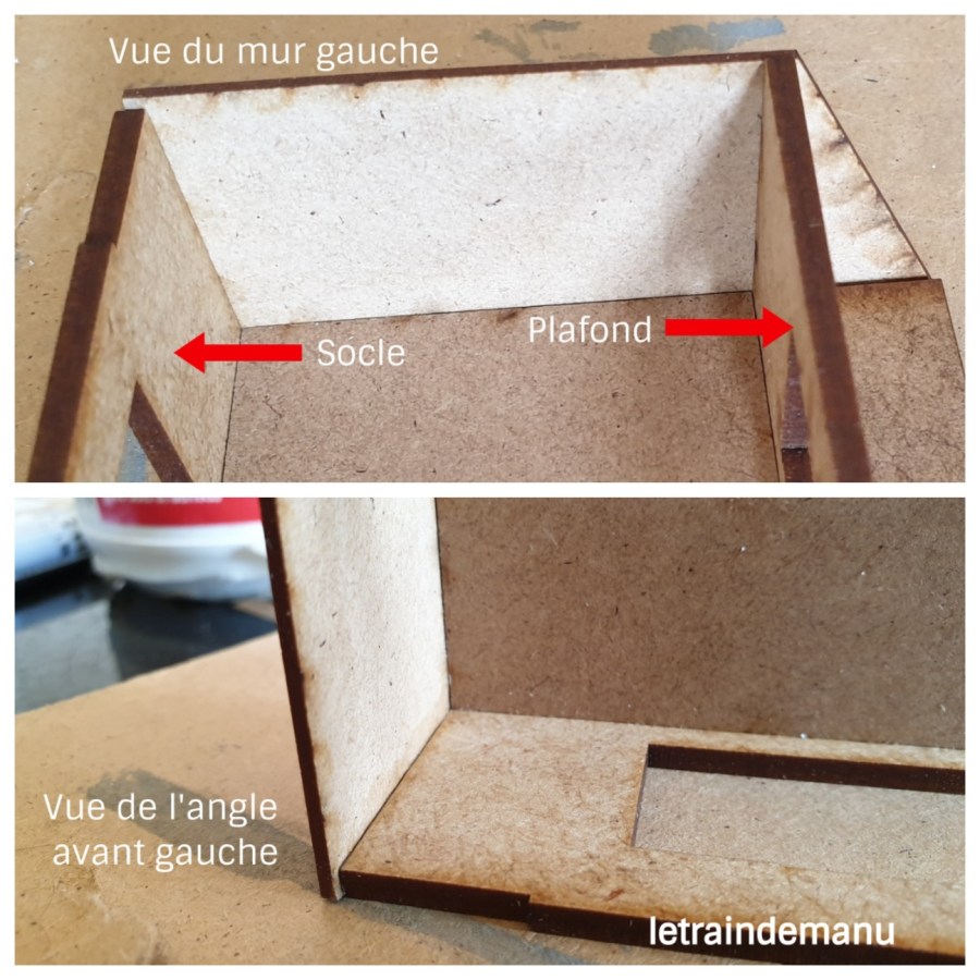 Je l’avoue, j’ai été un peu déconcerté pour le démarrage ne comprenant pas bien l’assemblage de ces pièces de structure (socle, plafond, fond haut, fond bas et murs pignons). Toute erreur à cette première étape pouvant s’avérer fatale pour la suite, j’ai donc pris contact par mail avec Cités miniatures pour avoir des précisions. Philippe Coquet m’a répondu très rapidement dans la journée en m’adressant une photo grand format de cette étape et une notice réactualisée. Un SAV sérieux, efficace et rassurant qui mérite d’être souligné.
