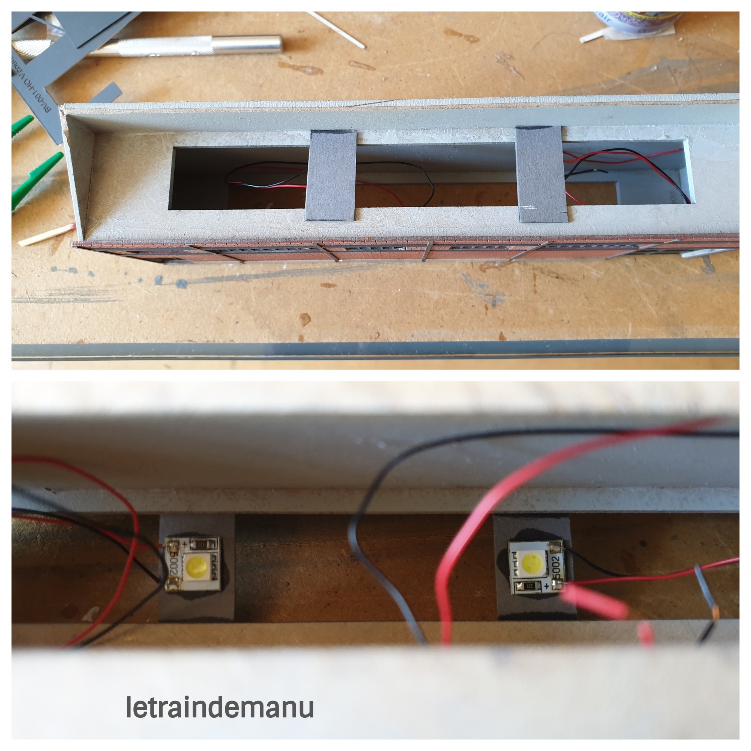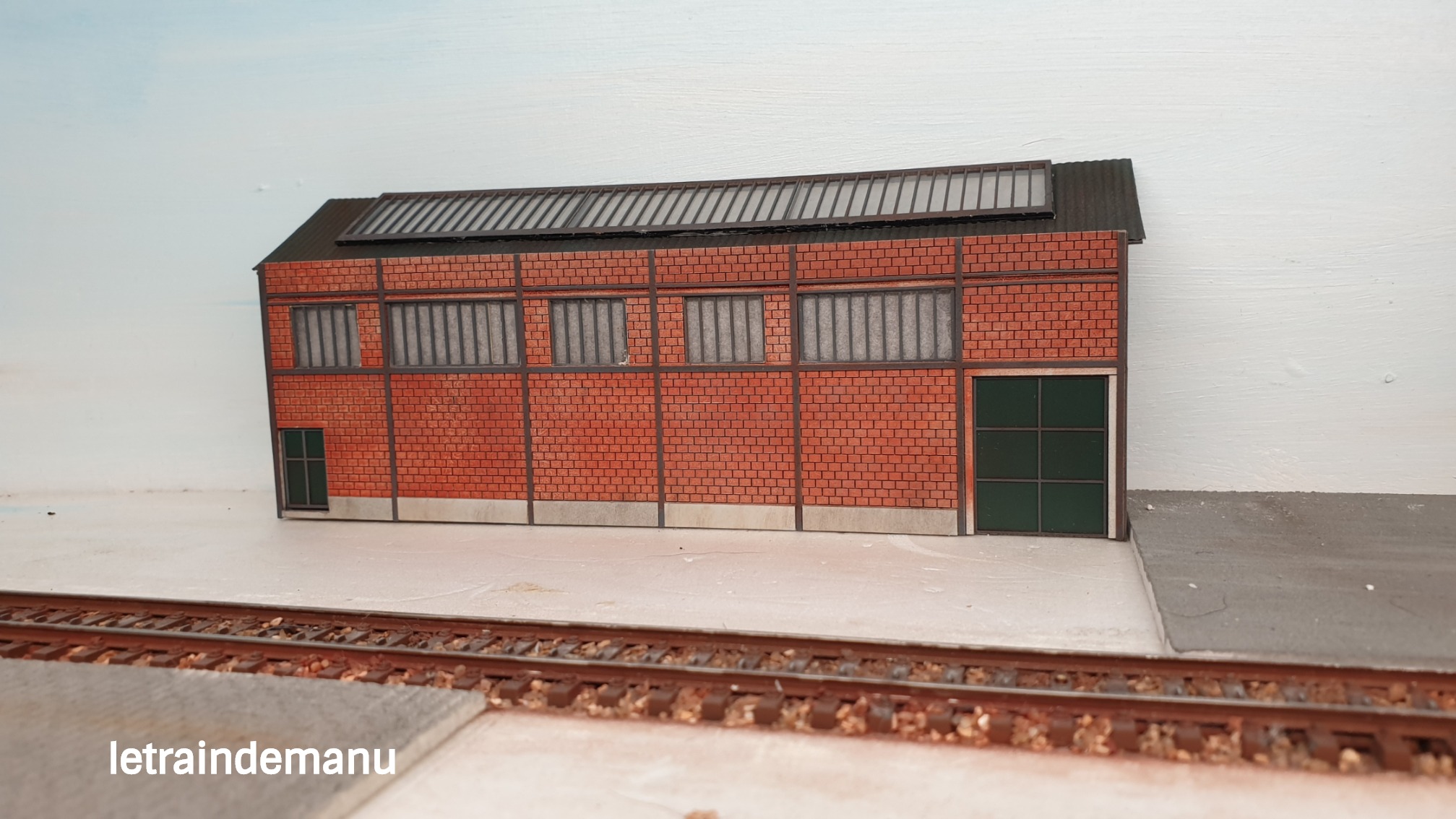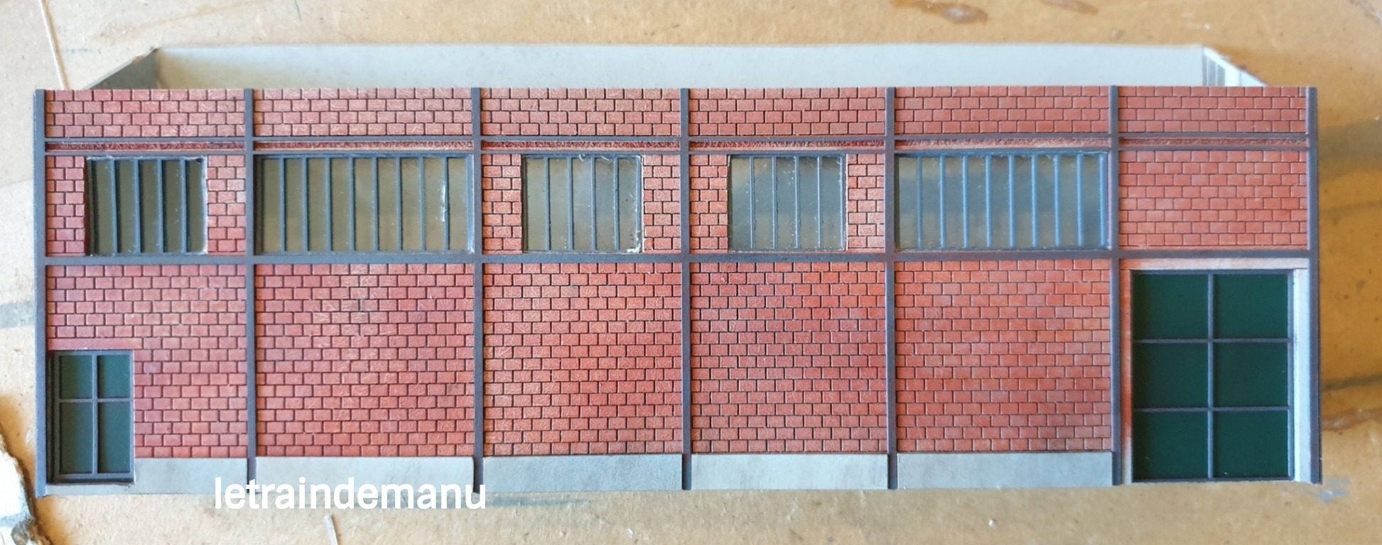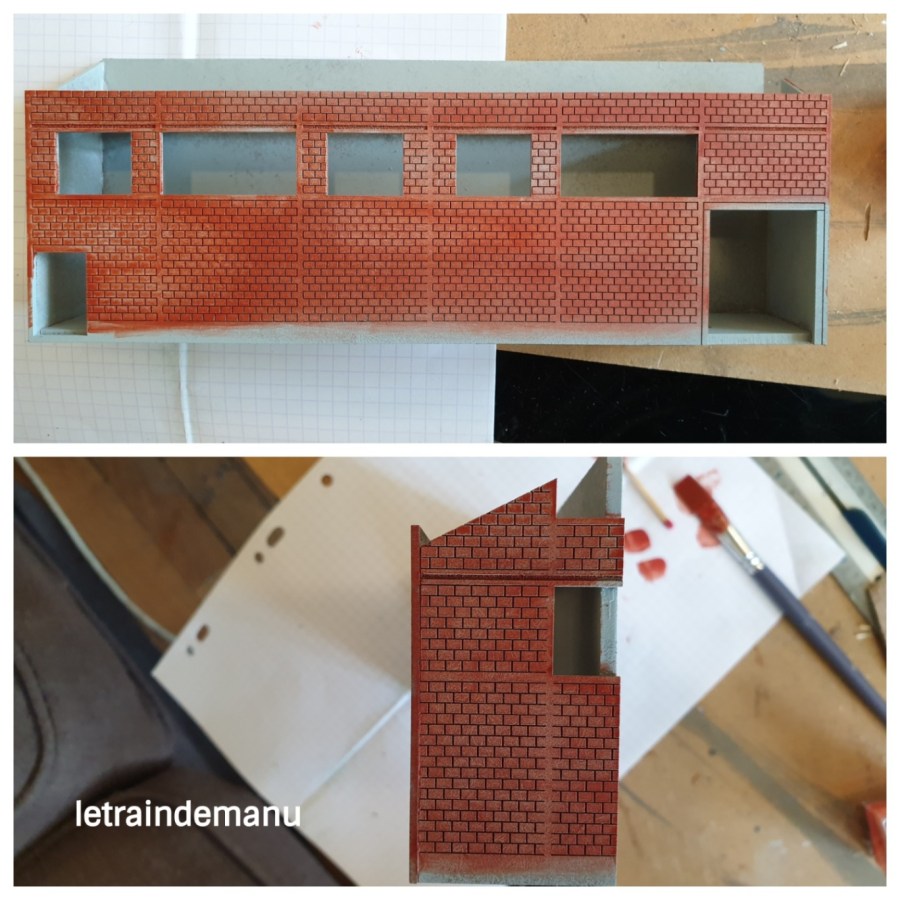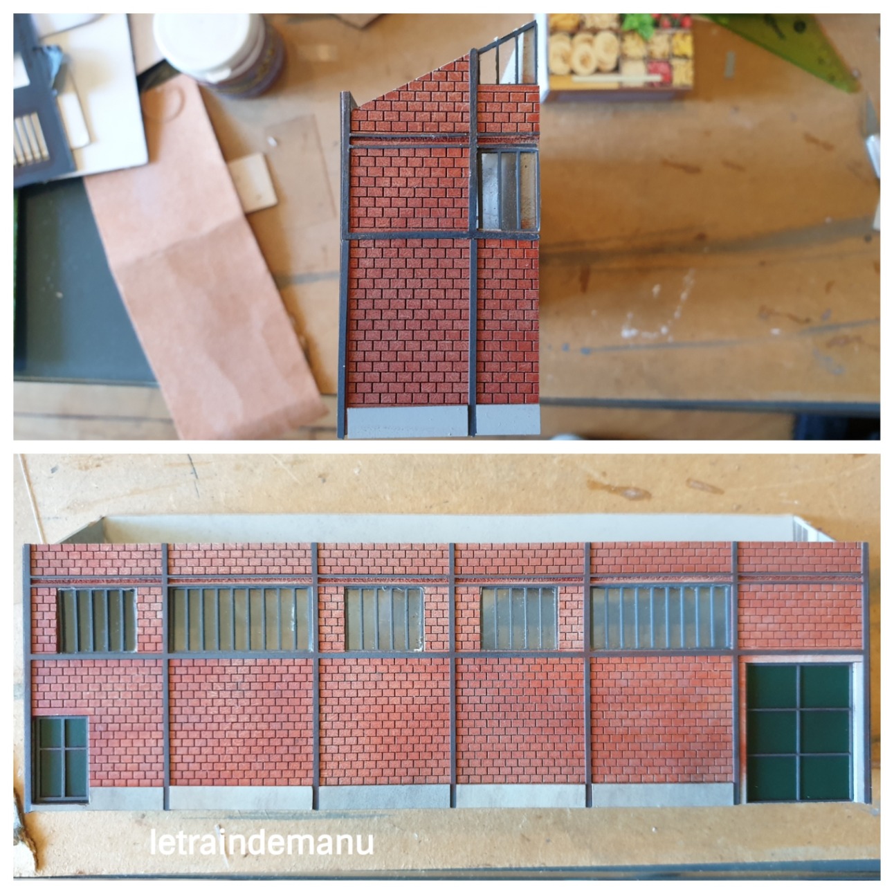 Photos 1299 et 1240 : Première peinture des briques et mise en situation sous éclairage sur le module. Source : letraindemanu.fr