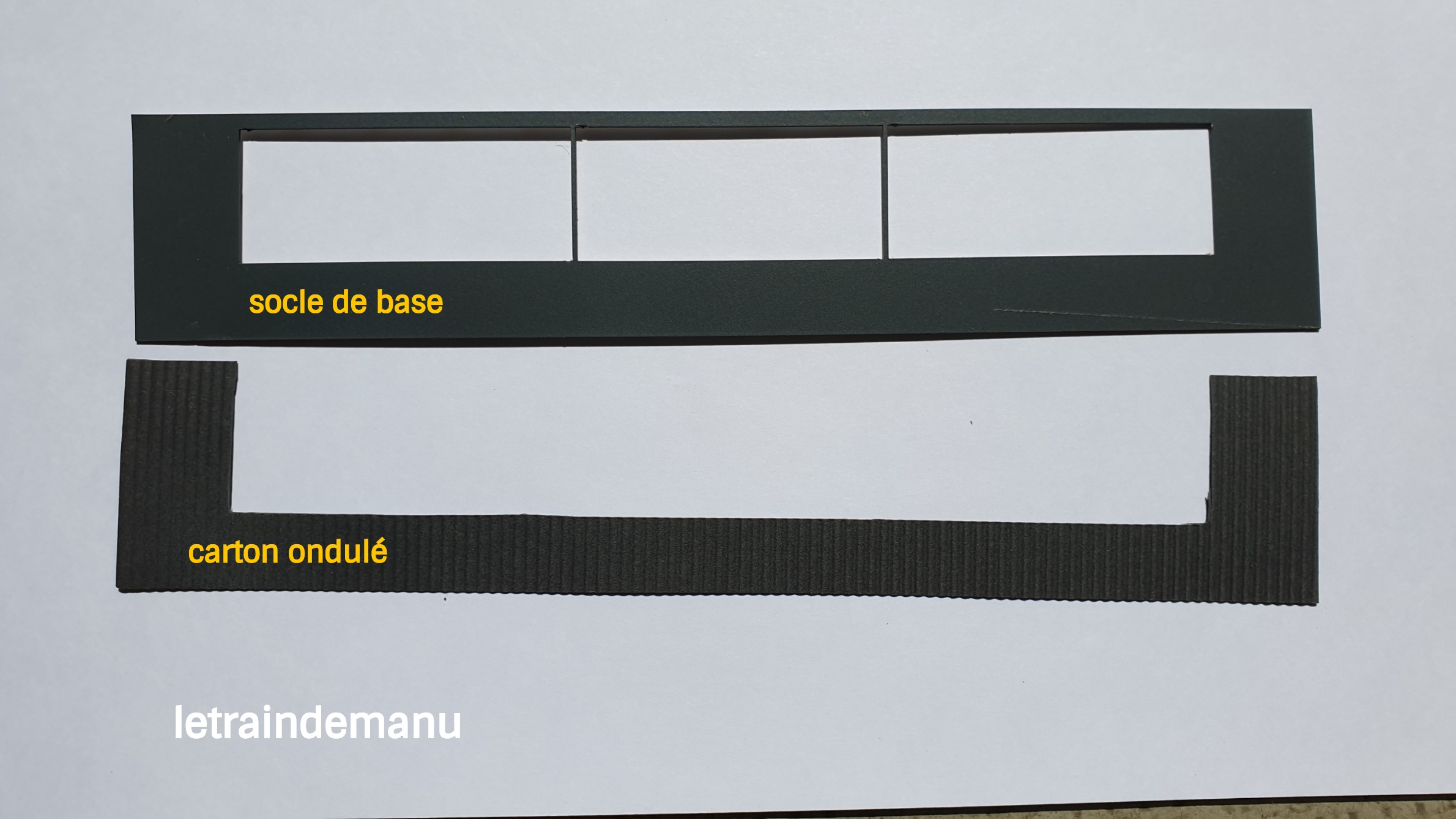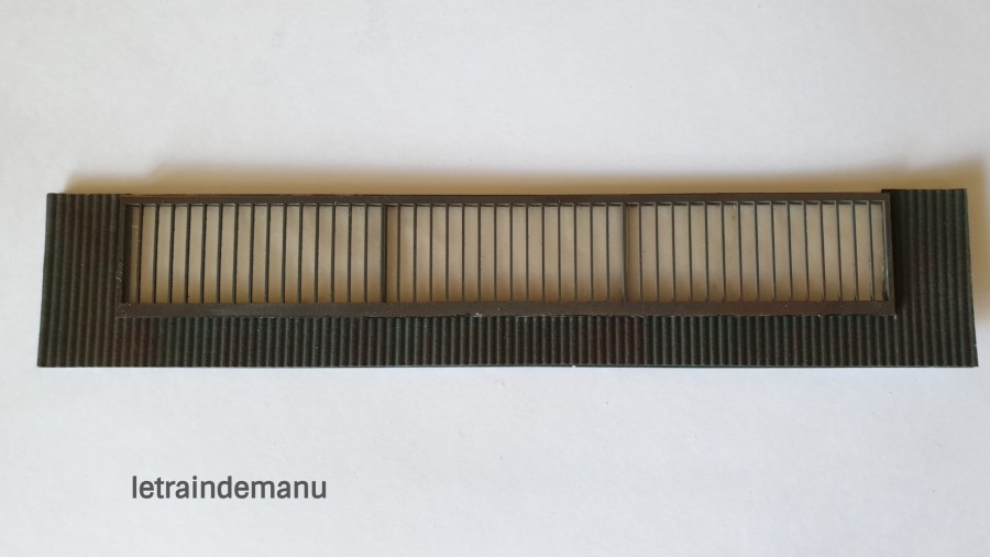 ● La tôle ondulée. Pièce en carton ondulée de couleur gris foncé. Je découpe la bande pour l’ajuster aux dimensions exactes du socle précédent. Puis je découpe l’intérieur aux dimensions des ouvertures.