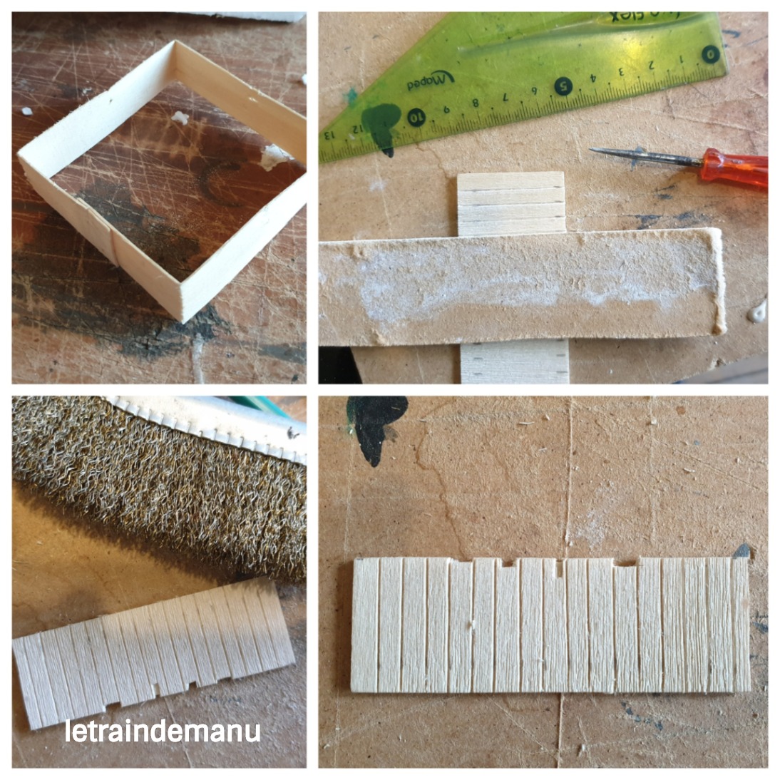 Pendant le séchage, je récupère une boite carrée d’un fromage bien connu dans ma boite à rabiots. C’est une boite dont les parois du couvercle sont en bois léger (le couvercle étant en carton). Je découpe un tronçon à la bonne longueur avec un gros cutter dédié. La hauteur est de 28mm. Attention, ce bois fin est fragile. Un règle métallique carrée me guide et surtout protège les doigts en évitant le ripage de la lame. Plusieurs passes sont nécessaires pour une découpe sans risque de fragmentation.