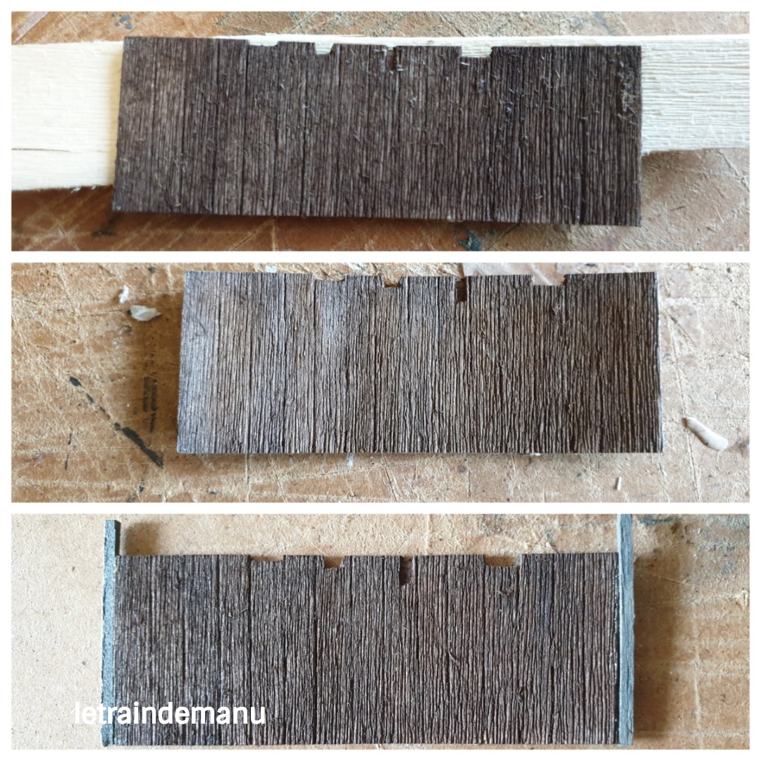 Avec une pointe métallique, je trace des traits verticaux tous les 5mm pour figurer les planches. Là encore, trois passes permettent une bonne gravure. Puis, je frotte doucement toute la surface avec une grosse brosse métallique, dans le sens vertical, pour tracer les veines du bois. Les opérations sont réalisées sur l’autre face, la clôture étant visible des deux côtés.