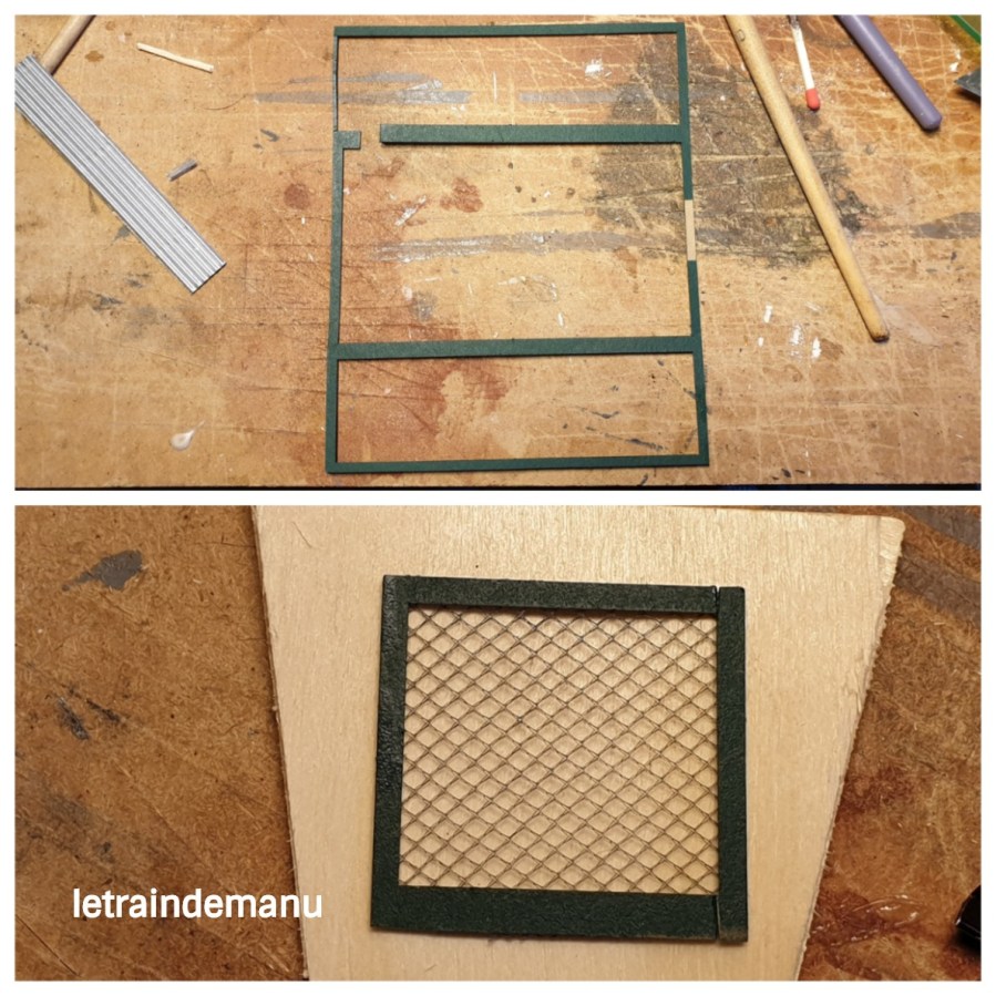 Le portail sera présenté en position ouverte. Il ne sera donc visible que d’un seul côté. Dans ma boite à rabiots de maquettes laser-cut, je récupère une chute de carton de 1mm d’épaisseur et j’y découpe un cadre aux dimensions souhaitées. Il est peint en vert foncé avec de la peinture en bombe (gamme Do it ! de chez Marabu – Pas de peinture acrylique au pinceau car le carton risque de gondoler). Ne pas oublier de peindre les tranches intérieures et extérieures.