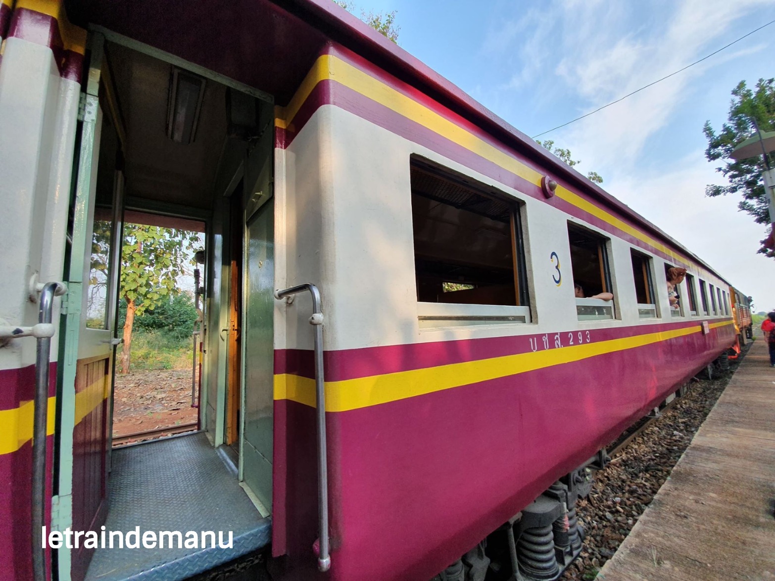 Photo 1353 : une voiture voyageurs du SRT 3e classe en gare de Kanchanaburi en novembre 2019. Source : letraindemanu.fr