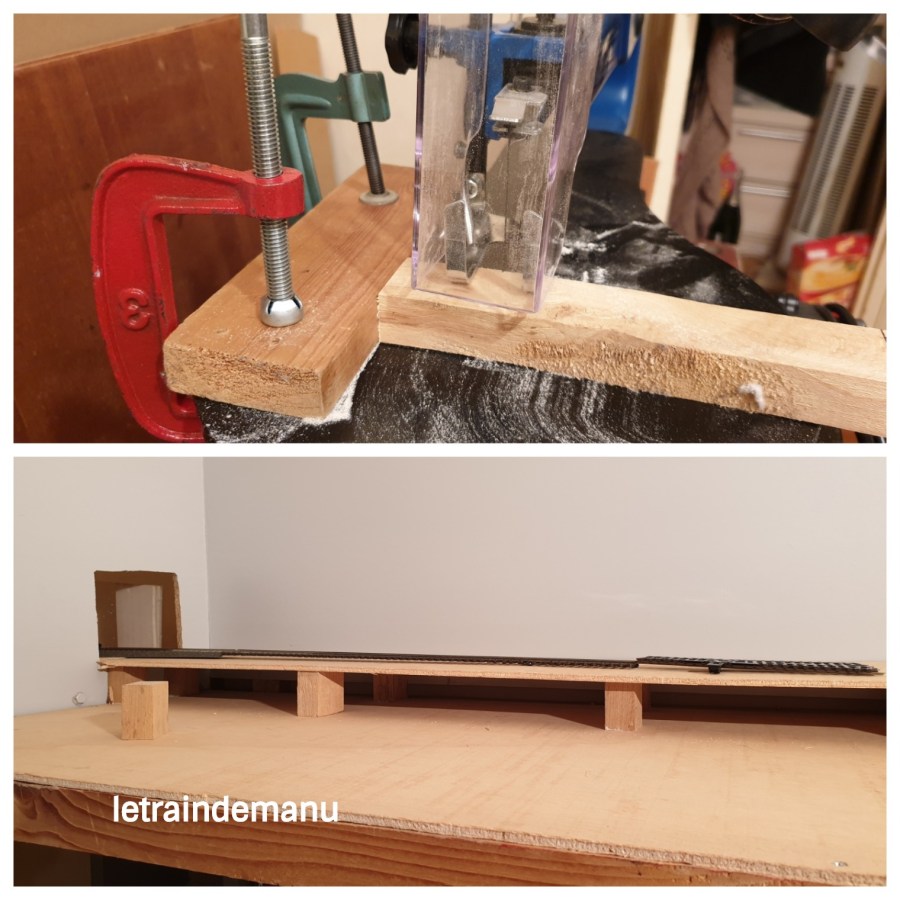 Pour cette seconde tranche, j’ai souhaité avoir un petit relief négatif. Pour ce faire, ma plateforme de voie est montée sur des morceaux de tasseaux découpés à la scie à chantourner. Pour avoir de piliers bien d’équerre, une chute de tasseau est fixée sur le plateau de la scie et me sert de guide pour ces découpes répétitives..