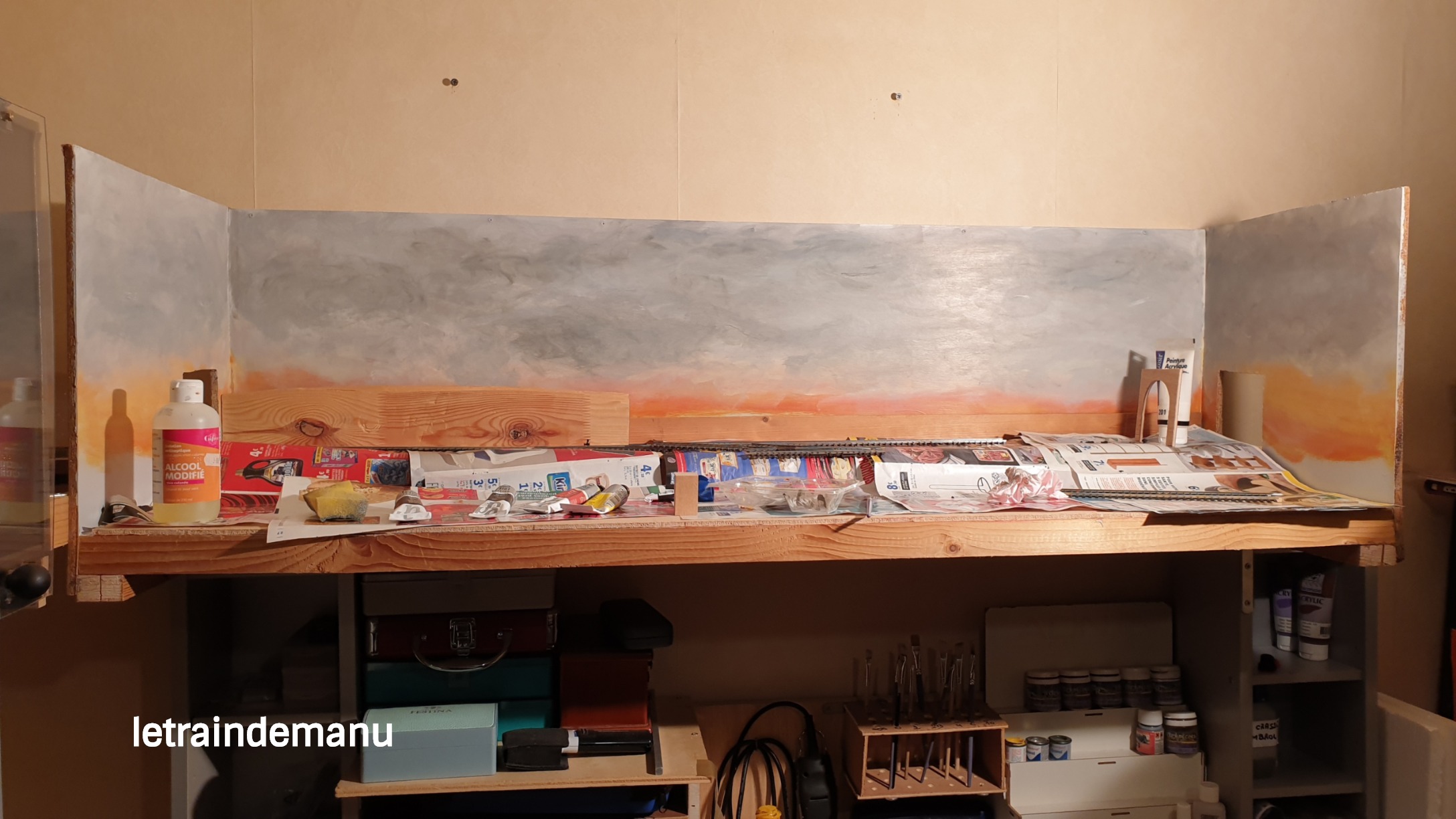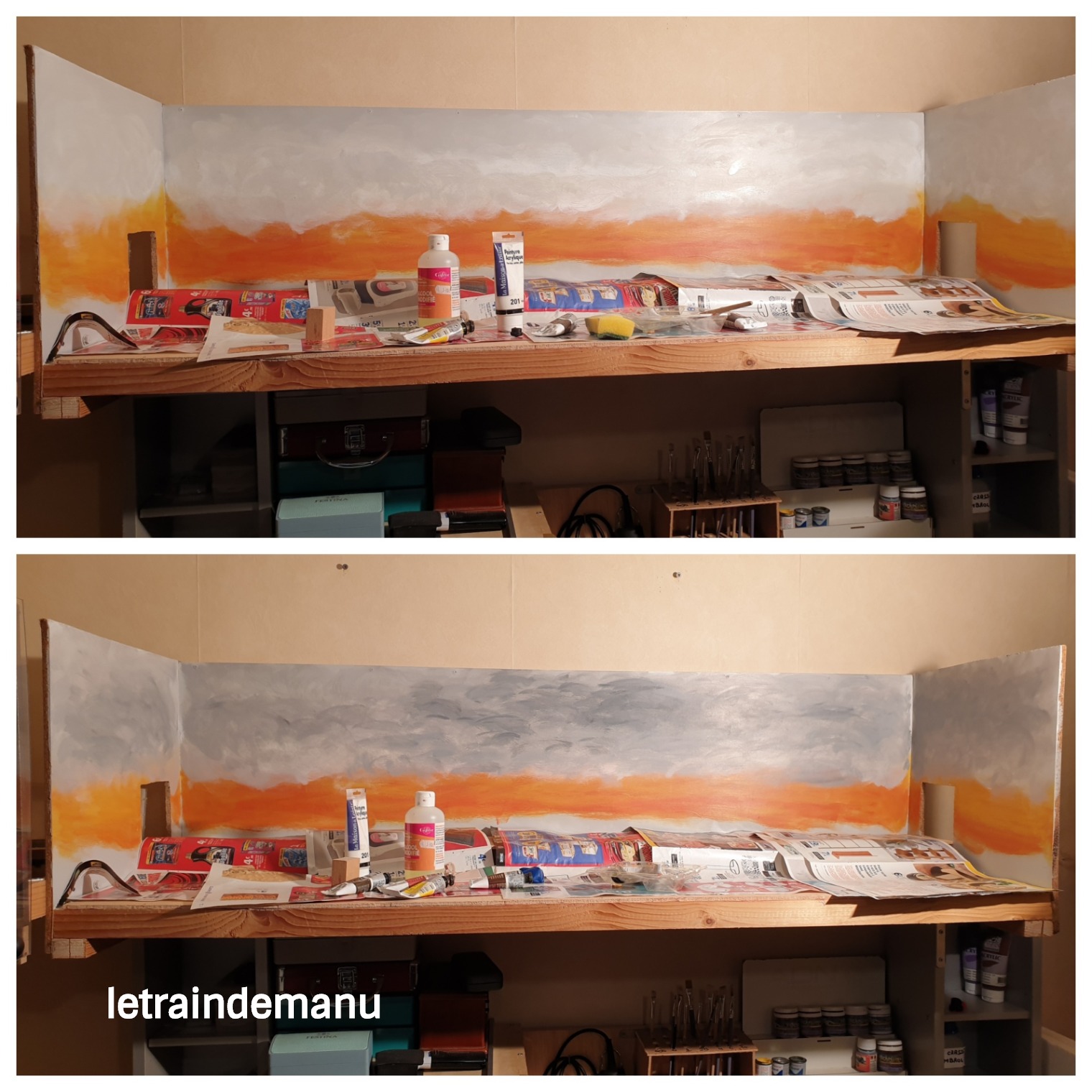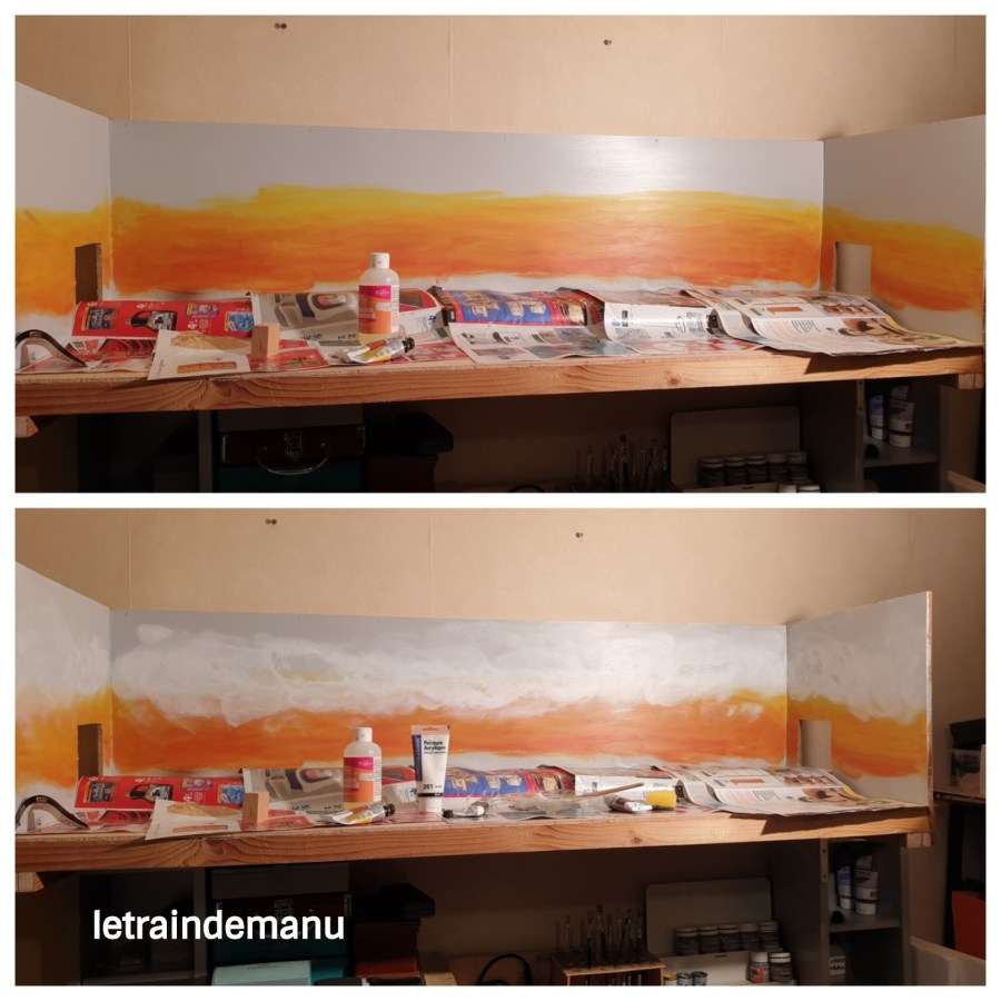 Photos 1412 à 1414 : les différentes étapes de peinture du fond de décor. Source : letraindemanu.fr
