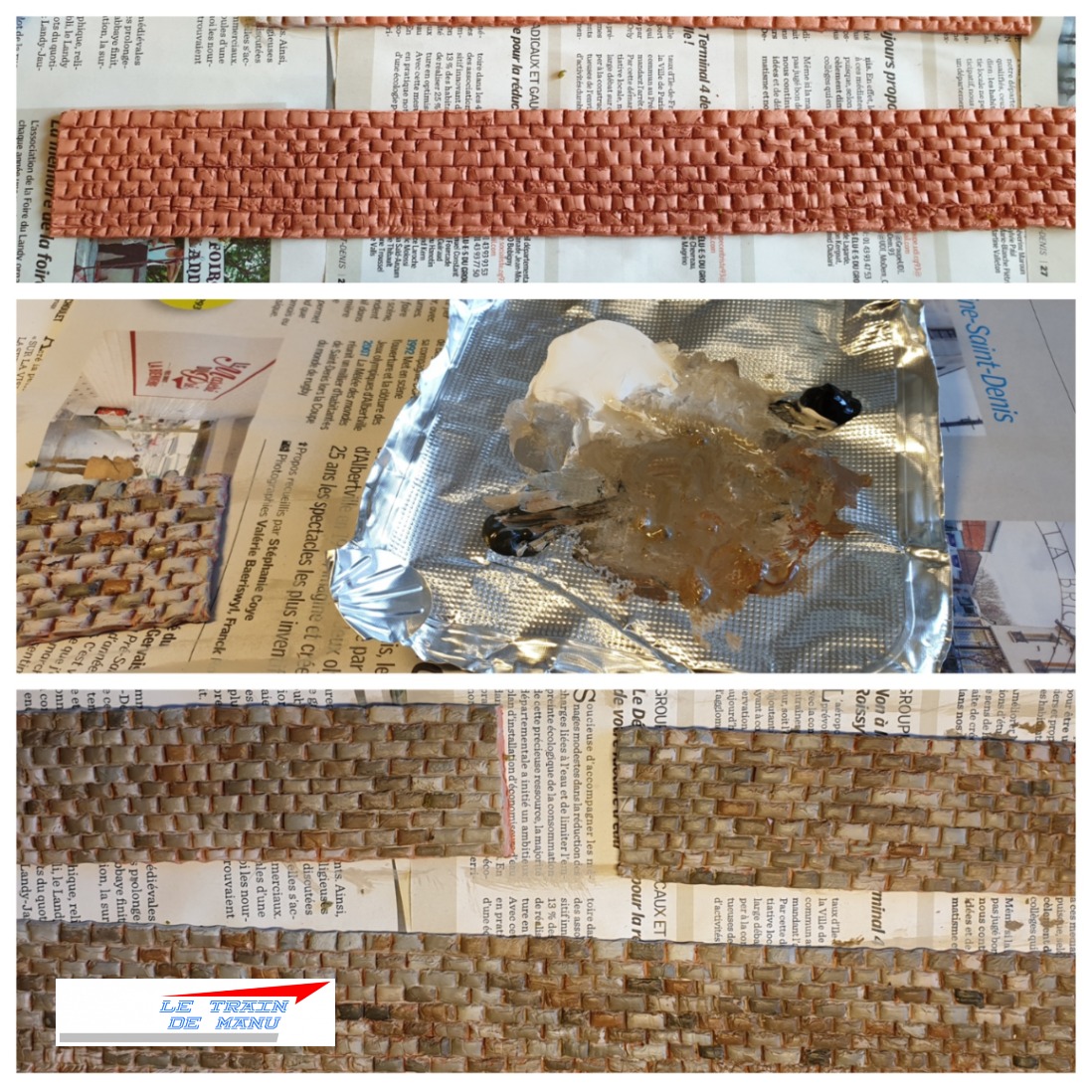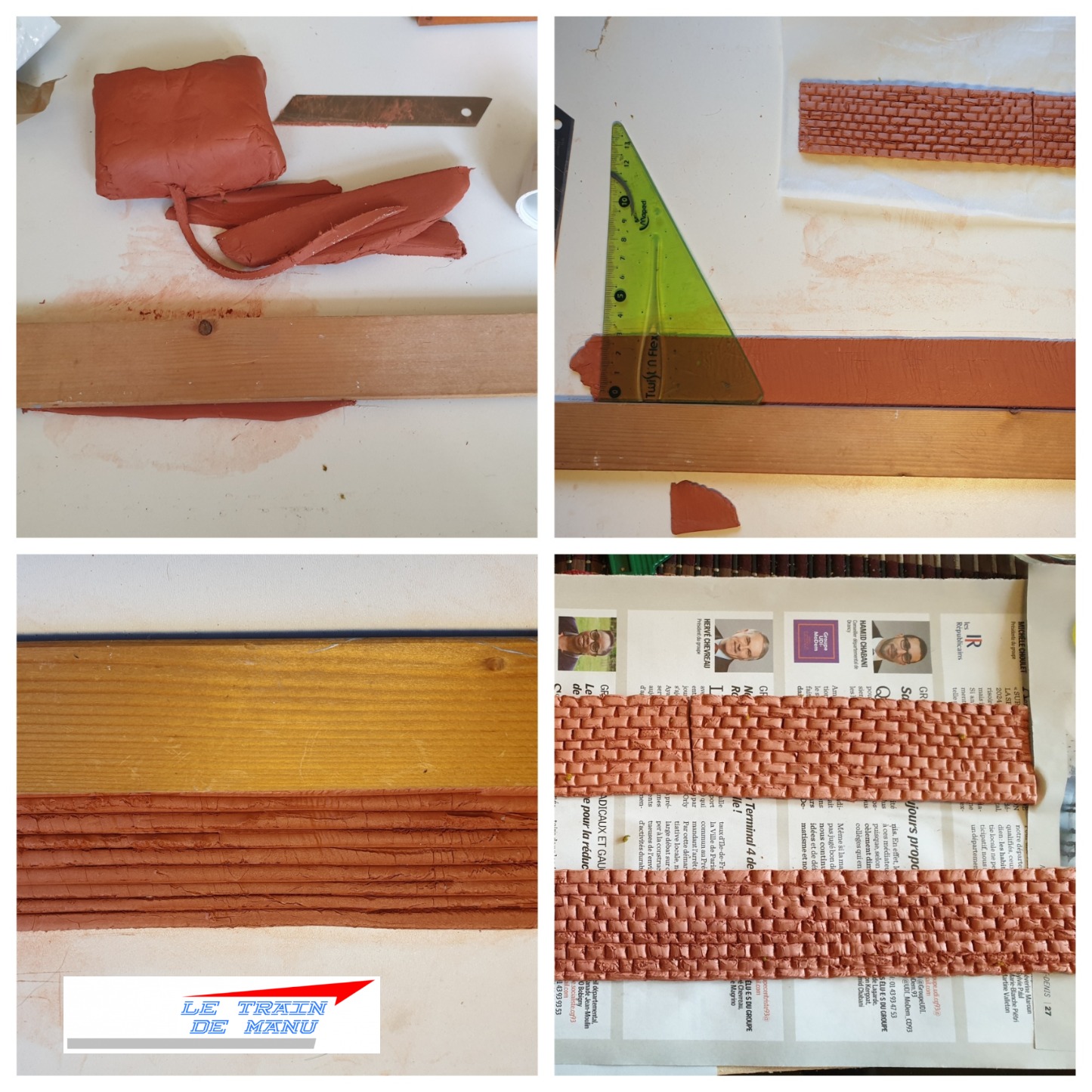 Il me faut un mur, un long mur, de soutènement pour enjoliver mon talus de fond de décor du dépôt : 132 centimètres de long sur 42 millimètres de haut. Le moins onéreux est donc de le fabriquer soi-même. Pour cela, deux méthodes sont possibles : soit la gravure sur une plaque de Carton-Plume® pelée sur une face (impérativement de marque Canson, produit original), soit la gravure sur pâte à modeler qui sèche à l’air. La première méthode est semblable à mes cours pavées dans ZI Nord.