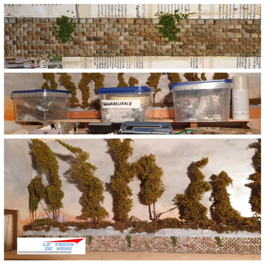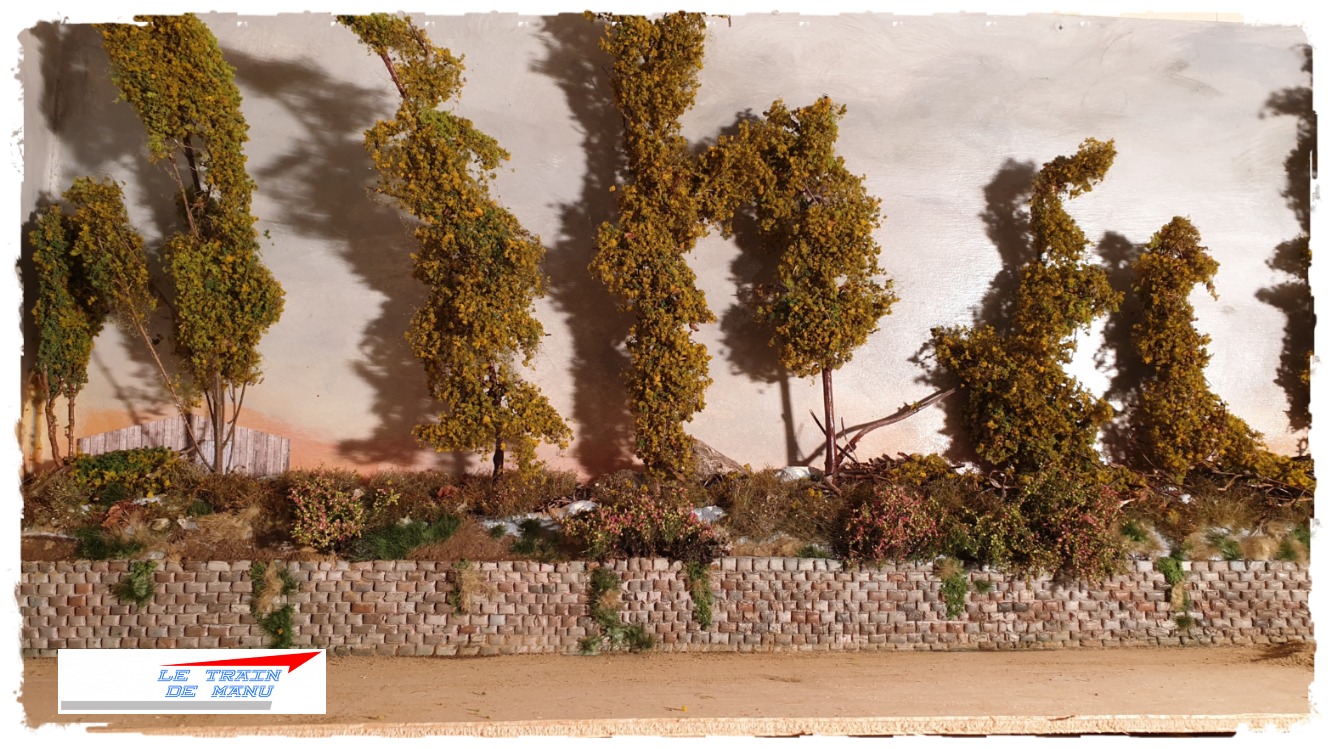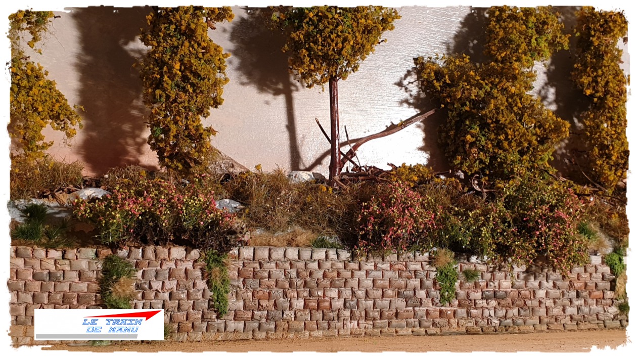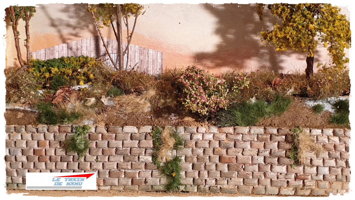 Voilà un petit muret qui habille bien mon talus. Petit budget et agréable moment de modélisme.